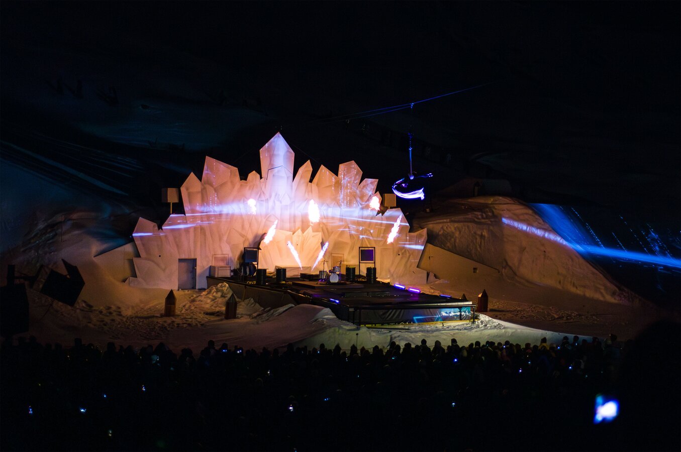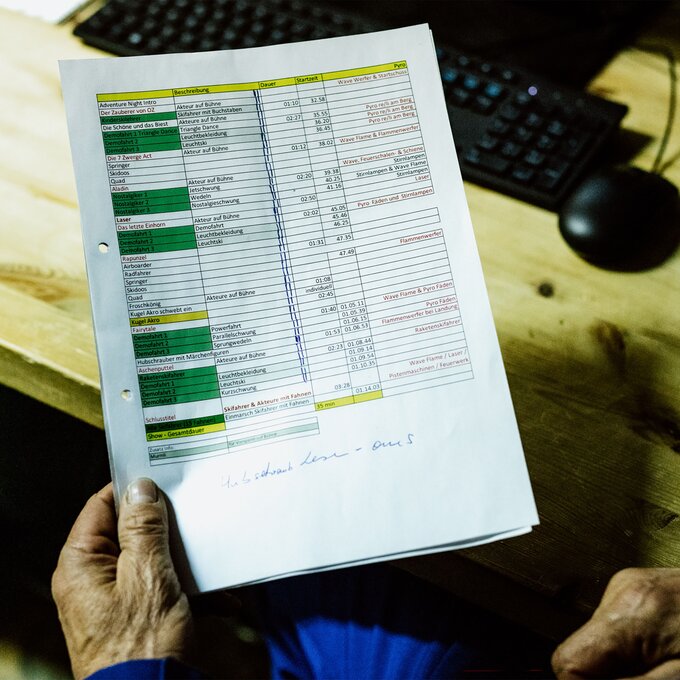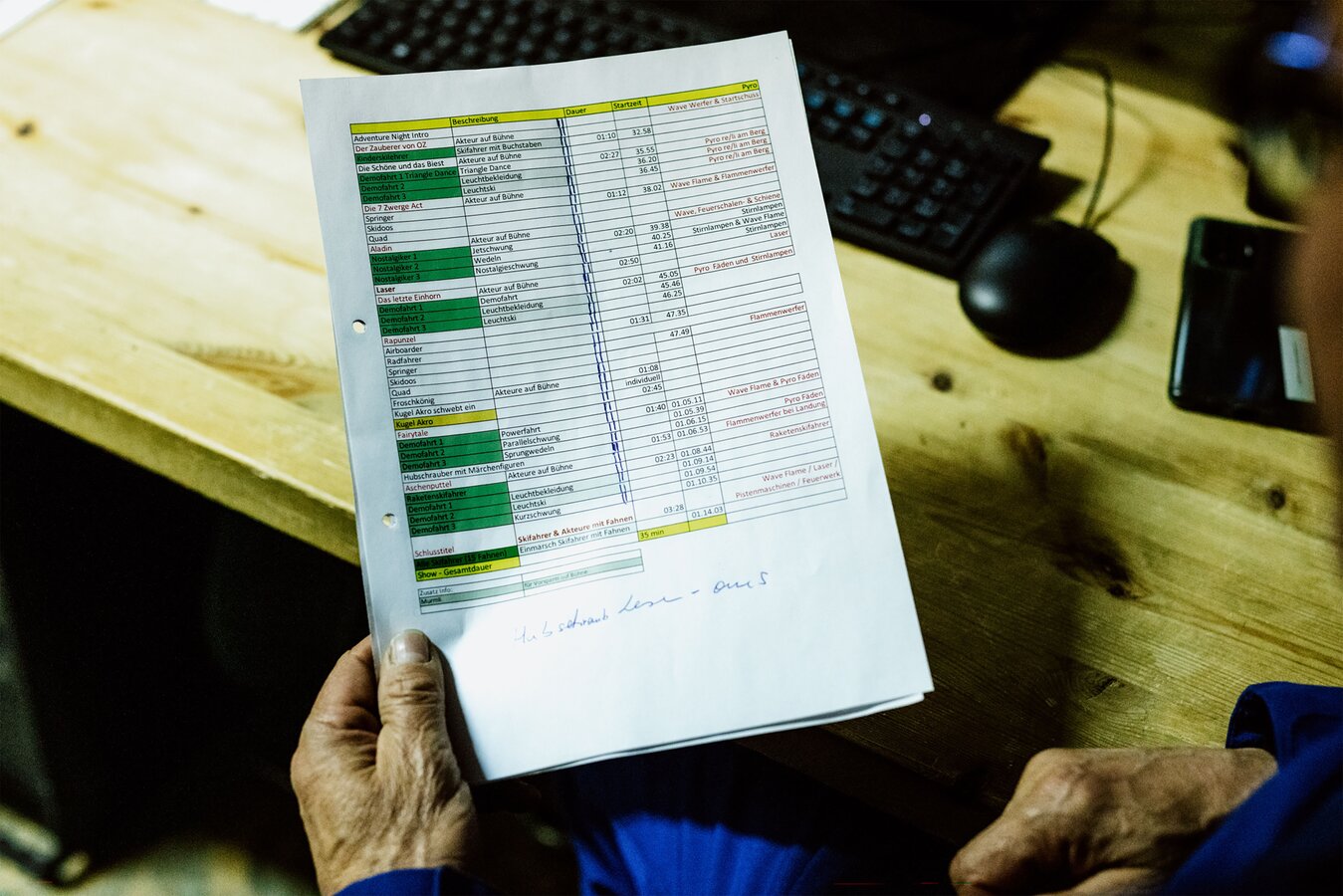 Im Technikraum haben mittlerweile auch die anderen aus Alfons‘ Team Platz genommen. Unter ihnen ist Wolfgang Timischl, genannt Wolfi. Er steuert das DMX-Pult und ist seit 19 Jahren dabei. Gibt’s da noch Stress und Aufregung vor den Shows? „Vor der ersten Show auf jeden Fall!“, sagt Wolfi. „Der erste Abend ist der wichtigste in der Saison, wenn der gut läuft, ist der gesamte Winter für uns gerettet“, ergänzt Alfons. Das heißt aber nicht, dass nach der überstandenen Premiere immer alles glatt läuft: Erst vor zwei Wochen sei der „worst case“ eingetreten, das DMX-Pult habe kurz vor einer Show nicht mehr funktioniert, erzählt Wolfi. „Da entsteht dann schon Hektik“, sagt Alfons. „Meist geht aber alles gut und dann machts auch Spaß!“