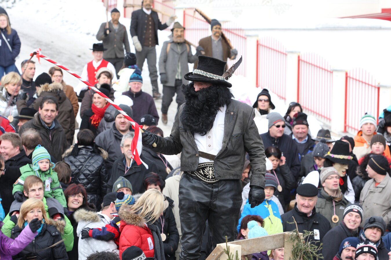 Auch dem Bajatzl wird beim Fisser Blochziehen so einiges an körperlicher Leistung abverlangt. Eine gute Vorbereitung, gute Kondition und Koordination sowie Trittsicherheit und Mut sind Voraussetzungen, um diese Rolle bestmöglich zu verkörpern.