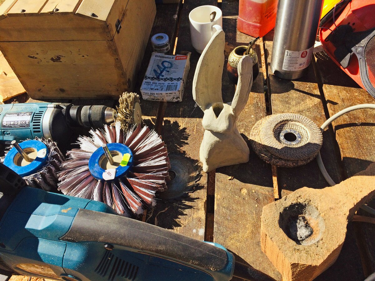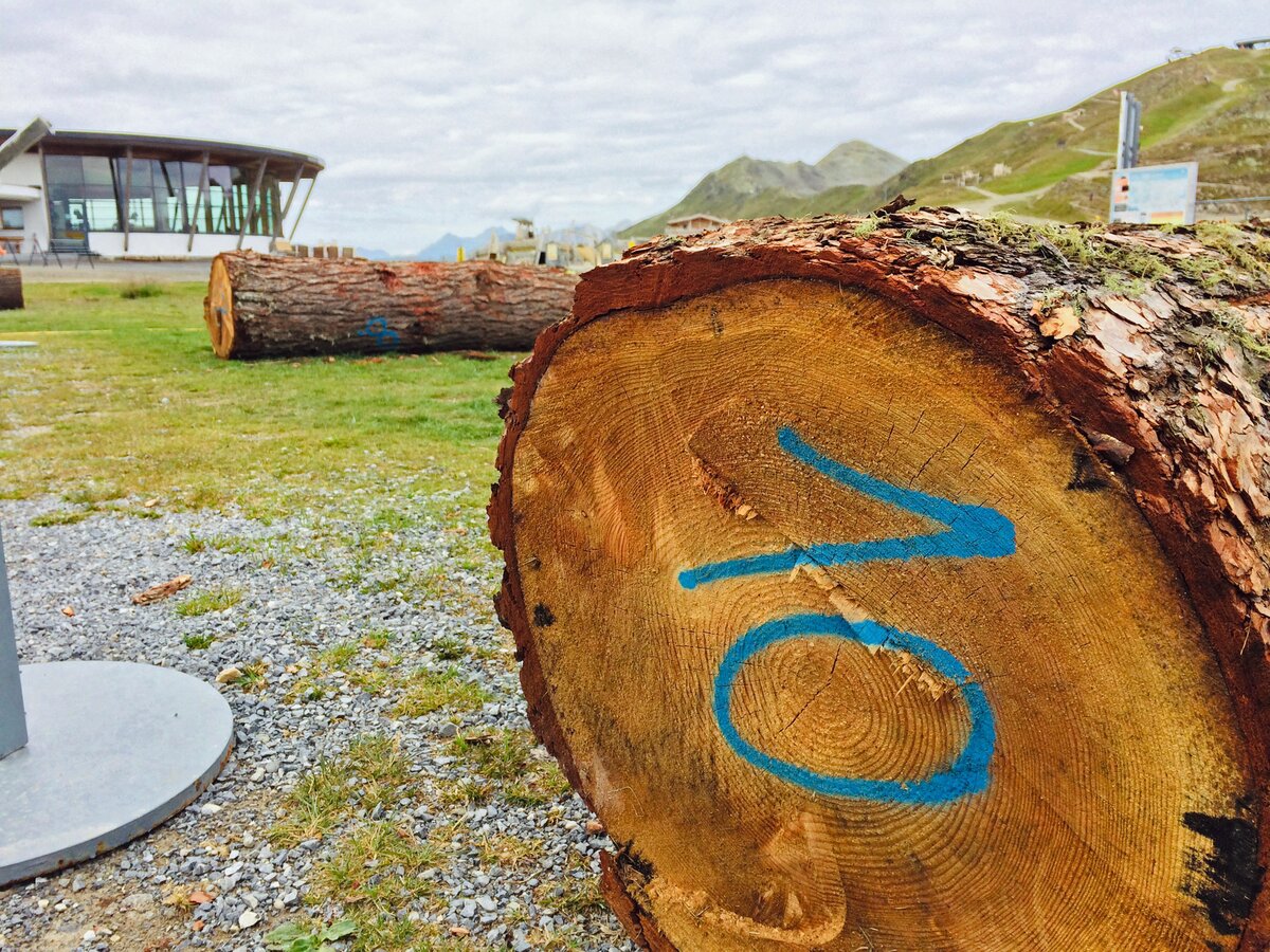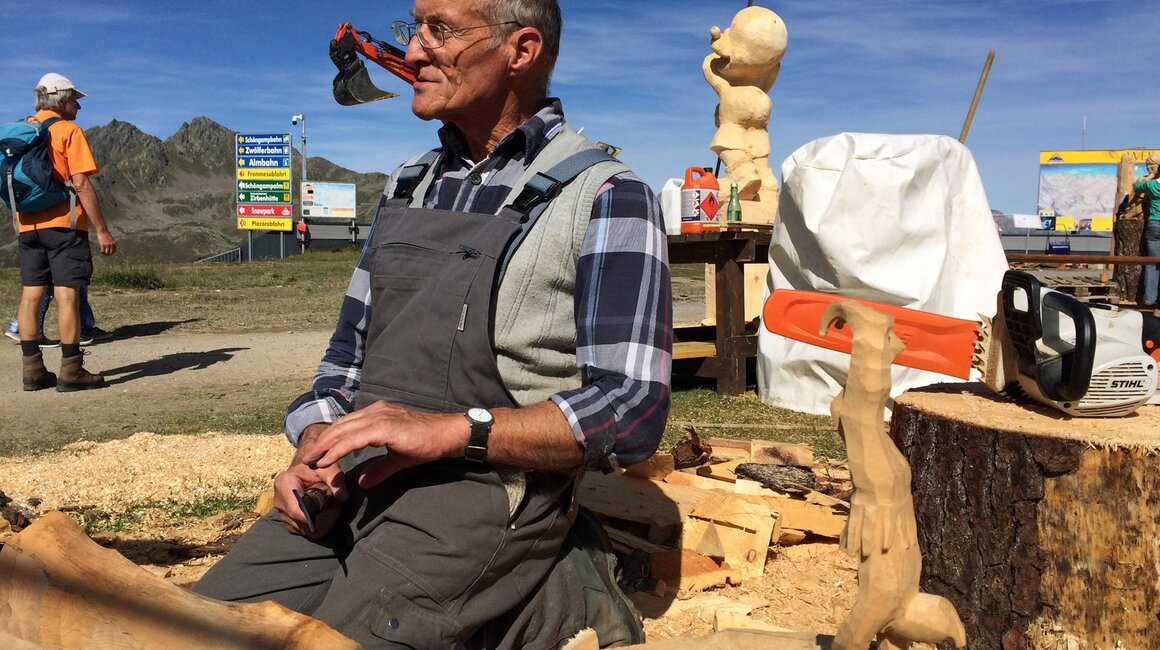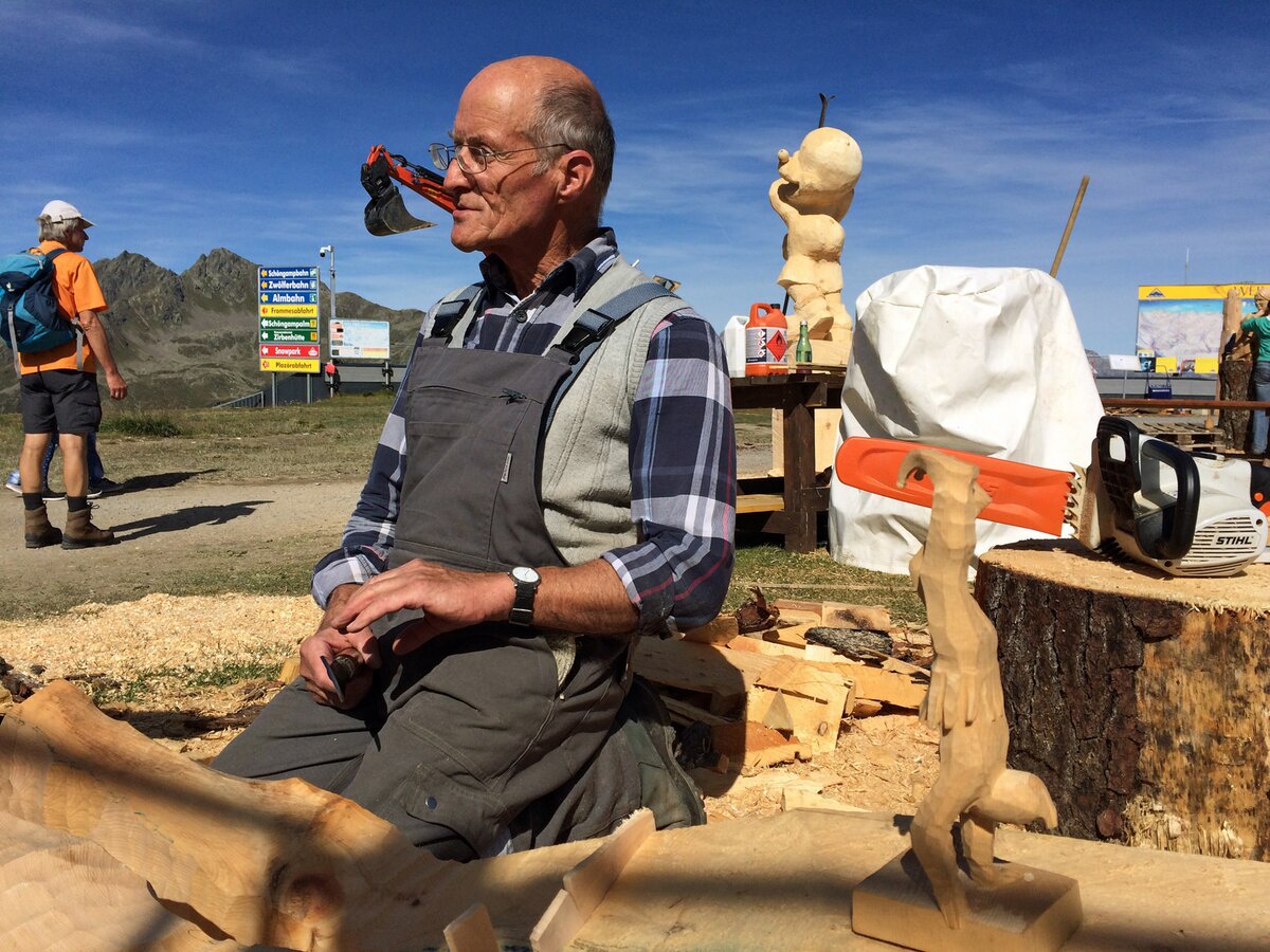 Drei Künstler arbeiteten mit Stein, drei mit Metall und neun weitere mit Holz. Der Materialmix sorgte für die unterschiedlichsten Kreationen. Das Holz stammt dabei unmittelbar aus Serfaus-Fiss-Ladis. Mit LKWs wurden die Lärchen- und Zirbenstämme an den Aktionsort transportiert. Nummern dienten der Orientierung. Eine so große Veranstaltung braucht schließlich Ordnung. Auf die Wünsche der Bildhauer bezüglich der Holz- oder Steinart und Größe wurde selbstverständlich eingegangen. Siegfried Krismer aus Fiss erzählte mir, dass er Zirbenholz bevorzugt: „Zirbe ist ein weiches Nadelholz und lässt sich besser schnitzen als die Lärche“. Aus dem Holzrohling kreierte er bei Kunst am Berg 2019 eine bekannte Figur der Tiroler Fasnacht (genauer gesagt des Fisser Blochziehens): den Bajatzl. Sein Werk ist übrigens mein Favorit. Schon der Künstler selbst ist ein wahrer Charakterkopf. Die "Maschgerer in Zwergenformat" können übrigens beim Kinderblochziehen am 02.02.2020 begutachtet werden. Vielleicht stammt ja die ein oder andere Larve von jenem Fisser Bildhauer?