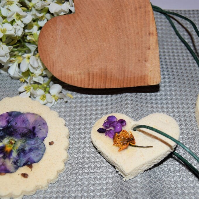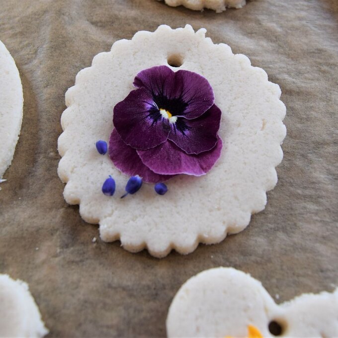 Schritt 2 - Ausstechen und verzieren Den Teig nun mit einem Nudelholz ausrollen und nach Belieben ausstechen. Ob rund, oval oder herzförmig, das entscheidest du. Salzteig mit Lieblingsblüten bestreuen und nochmals vorsichtig mit dem Teigroller drüber rollen, damit sie auch gut fixiert sind. Nun noch mit einem Strohhalm oder Holzstab (Zahnstocher) ein Loch machen, durch welches man dann später ein Band durchfädelt und die hübsche Bastelei aufhängen kann.