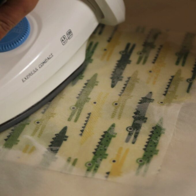Schritt 3 Bügelbrett mit einer Lage Backpapier abdecken. Stoffstück darauflegen und einige Wachsstücke auf dem Stoff verteilen.