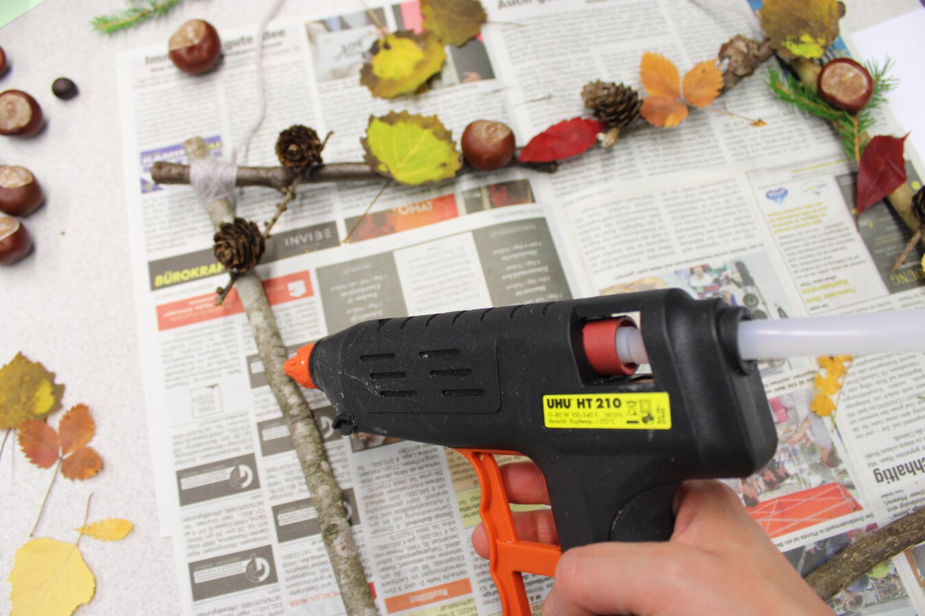 Mit der Heißklebepistole befestigst du die gesammelten Naturmaterialien rund um den Rahmen. Achte darauf, die Materialien abwechslungsreich anzuordnen, damit ein schöner, bunter Effekt entsteht.