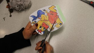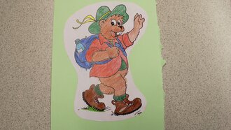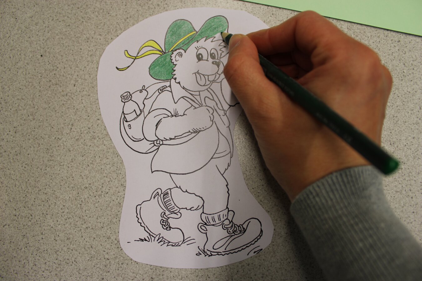 In der Mitte des Rahmens spazieren Murmli und Berta. Such dir eine Malvorlage auf der Murmli & Berta Website aus und drucke sie aus. Mit Buntstiften malst du sie bunt aus. Zur besseren Stabilität klebst du sie auf Tonkarton, schneidest sie anschließend aus und klebst sie auf den unteren Stock.