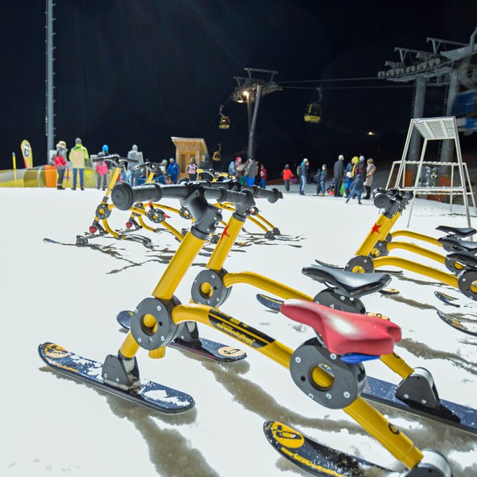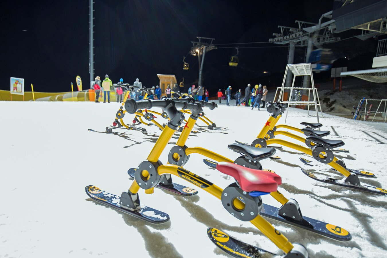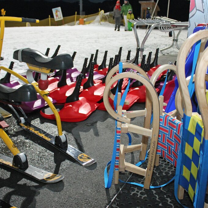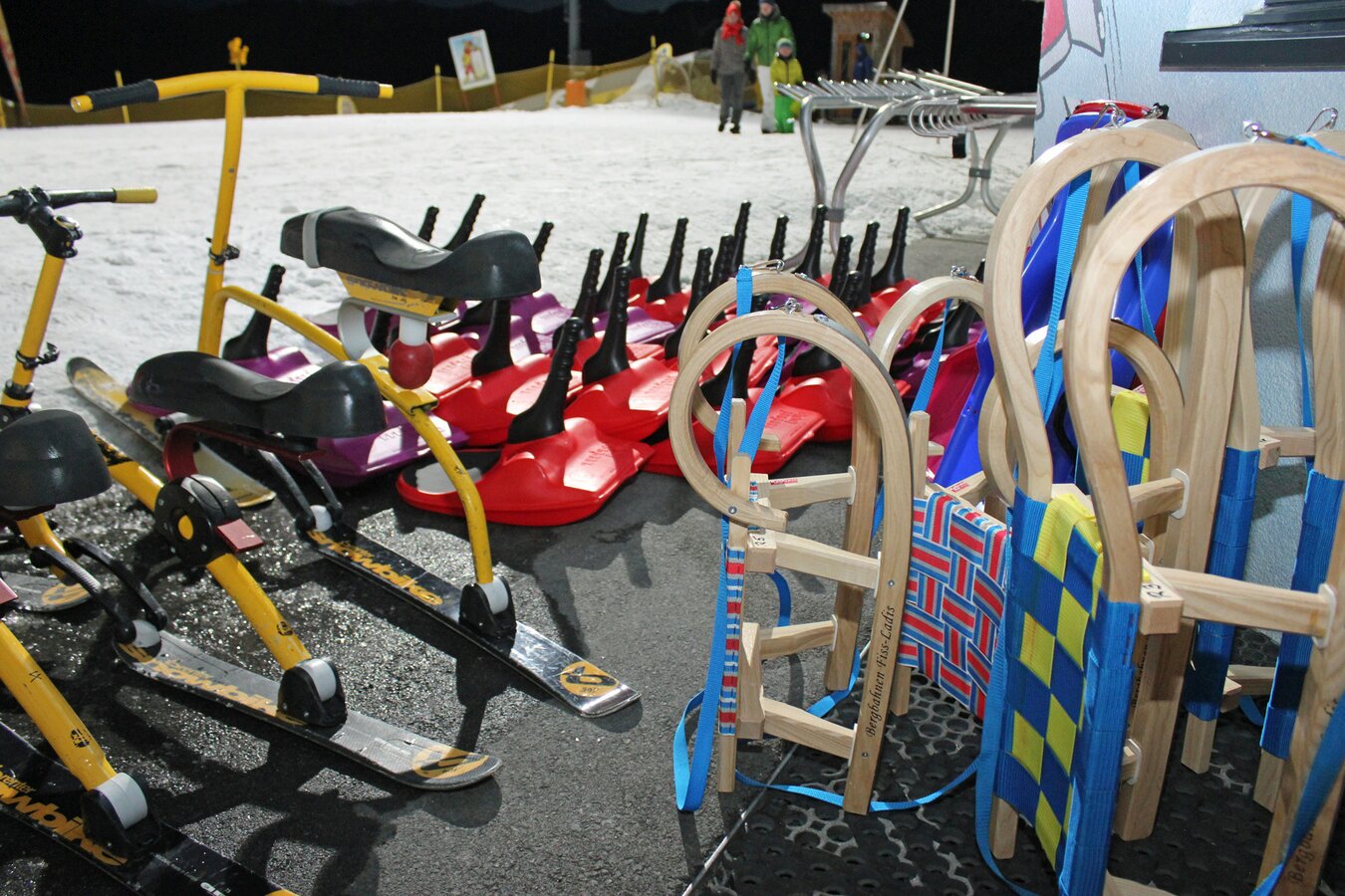 Wir unterhalten und mit Christoph, einem Mitarbeiter der Bergbahnen Fiss-Ladis, der das Förderband überwacht und die verschiedenen Funsportgeräte ausgibt. Er erzählt uns, dass die Snowbikes und Zipfelbobs bei den Kindern am besten ankommen. Aber auch die Rodeln, Rutscher und Skifox werden benützt. Zu leihen gibt es diese verschiedenen Geräte um € 5,00 pro Stunde. Natürlich können in dieser Zeit die Sportgeräte auch gewechselt werden. Christoph fragt uns, ob unsere Kids mal ein Gerät testen wollen. Uns so dürfen beide einmal den Hang mit einem solchen Funsportgerät ausprobieren. Tobias entscheidet sich für den Snowfox und Julia nimmt den leichter zu fahrenden Zipfelbob.