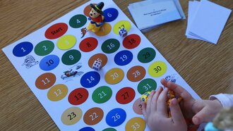 Bereitet ein Spielfeld aus Papier oder Stoff (altes Leintuch) vor, auf dem kreisrunde nummerierte Felder (von 1 bis 40) in einer Schlange angeordnet werden.