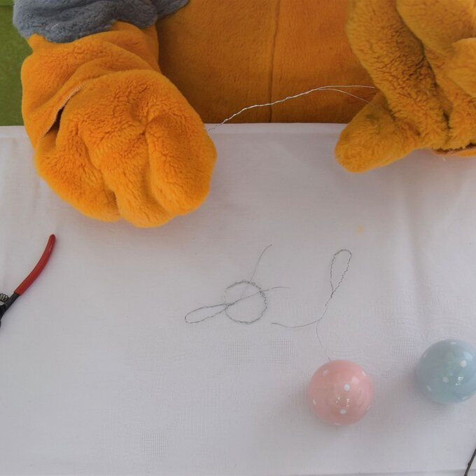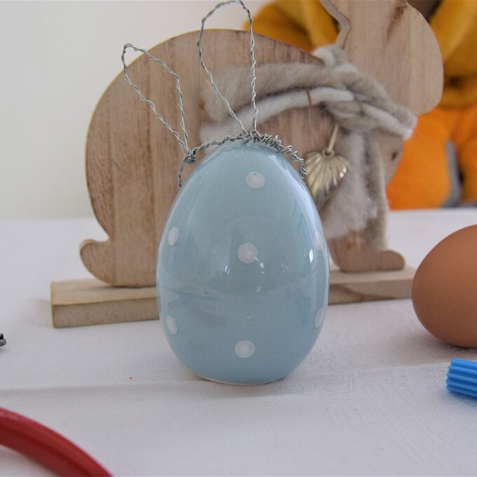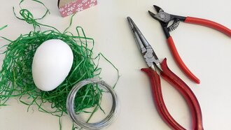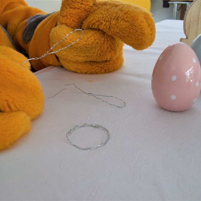 Faltet den Draht zuerst einmal in der Mitte und dreht diesen ineinander. Formt den Draht dann zu einem Kreis, welcher von der Größe her auf das Ei passt und verknotet die Enden, indem ihr den Draht um den Kreis wickelt. Und fertig ist die Basis!