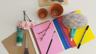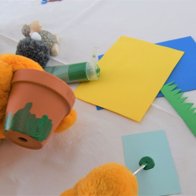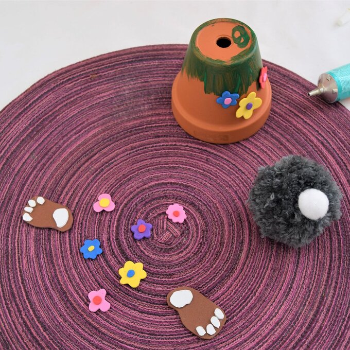 Bei der Gestaltung der Terrakotta-Töpfe könnt ihr euch anständig austoben. Ich male erst mit Bastelfarbe Gras rund um die Töpfchen und beklebe diese dann noch zusätzlich mit Blumen aus Moosgummi. Anstatt das Gras mit Bastelfarbe aufzumalen, könnt ihr auch das Gras aus Moosgummi ausschneiden und aufkleben.