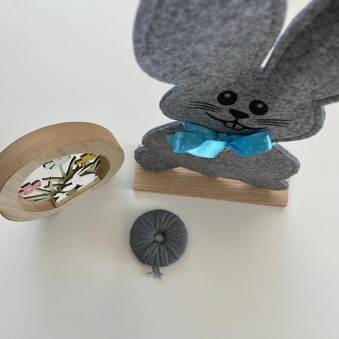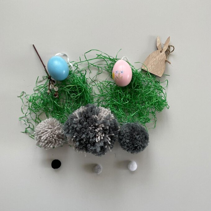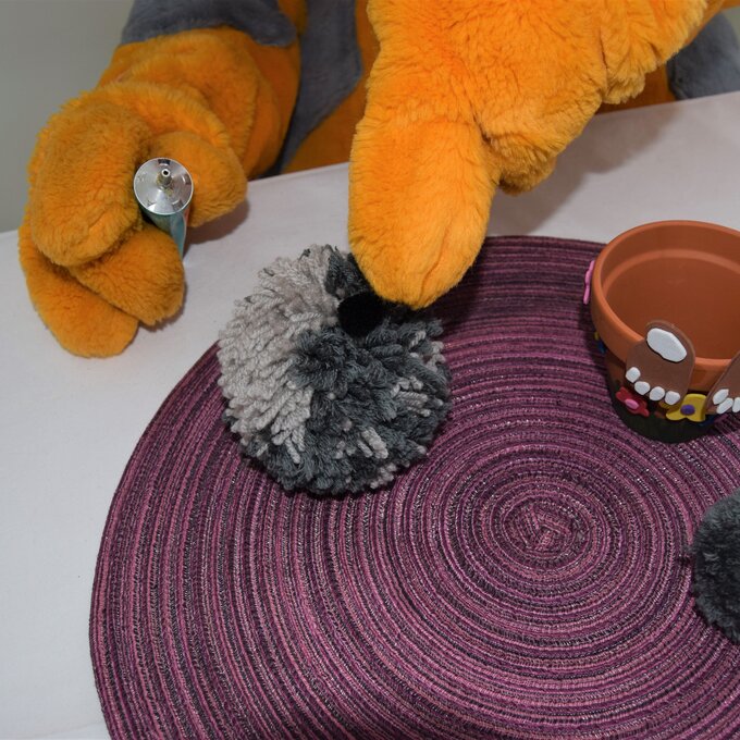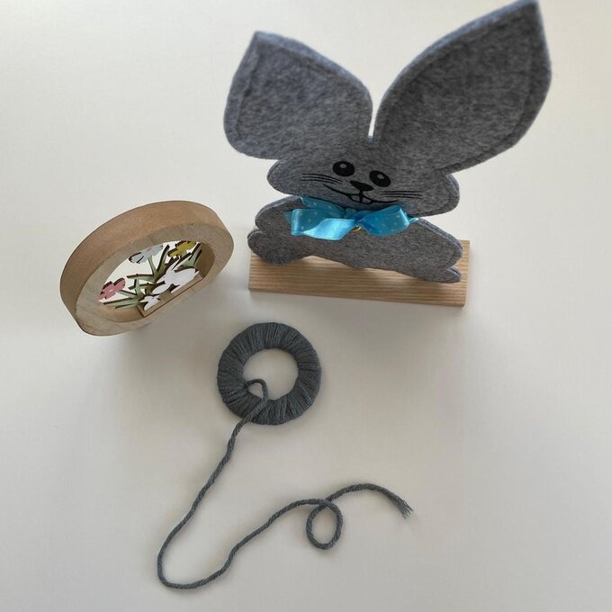 Für einen Hasen benötigen wir einen größeren Bommel und einen kleinen für das Schwänzchen. Für den größeren Bommel zwei kreisrunde Gefäße in unterschiedlichen Größen auf die Pappe stellen, mit einem Stift nachzeichnen und dann den Innen- und Außenring ausschneiden. Fertig? Dann mach´s gleich ein zweites Mal! Nun beide Pappringe aufeinanderlegen, mit der Wolle umwickeln und anschließend die Fäden rund um den äußeren Kreis aufschneiden. Nun zwischen den beiden Kartonplatten mit einem Faden umwickeln und binden. Den Kartonkreis seitlich einschneiden und den Bommel entfernen. Den Bommel zu einer wohlgeformten Kugel kneten und so zuschneiden, dass dieser in den Terrakotta-Topf passt. Für den kleinen Pompon erneut Schablonen vorbereiten – jedoch so klein, dass der gefertigte Bommel dann als Hasenschwänzchen passend ist.