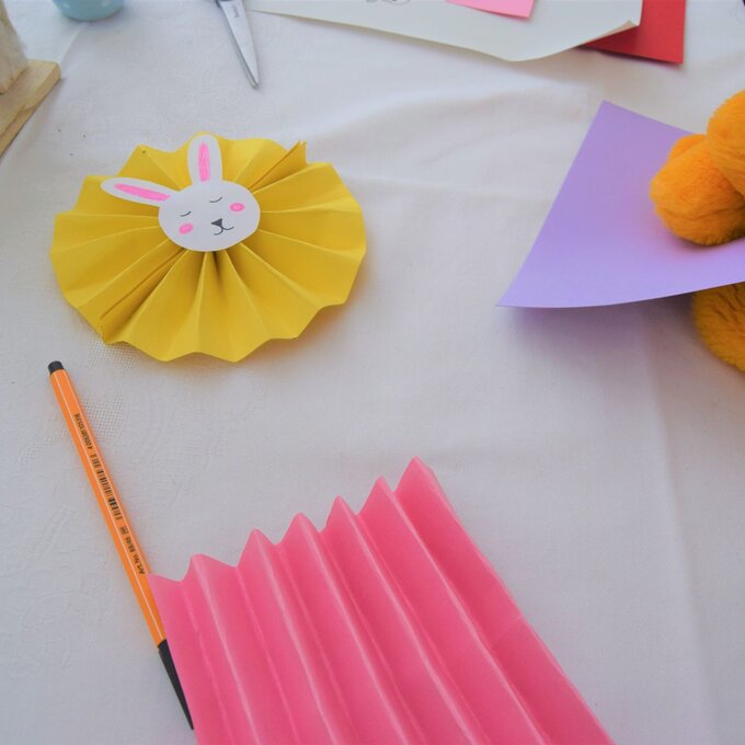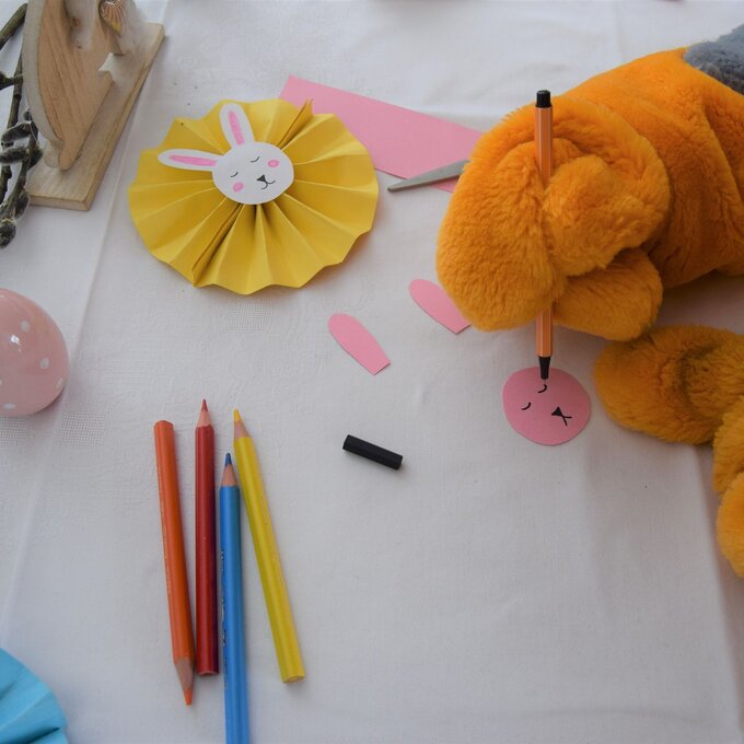 Für das Häschen Kopf und Ohren ausschneiden und mit einem Stift ein Gesicht aufmalen. Ich verziere den Kreis zusätzlich mit farbigen Wangen und Ohren. Klebe die Ohren hinten an den Kopf. Den Hasenkopf dann zum Schluss noch auf den Fächer kleben, mit einer Nadel oder einem spitzigen Stift durch den Papierfächer stechen und einen Faden anbringen.