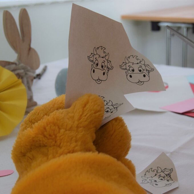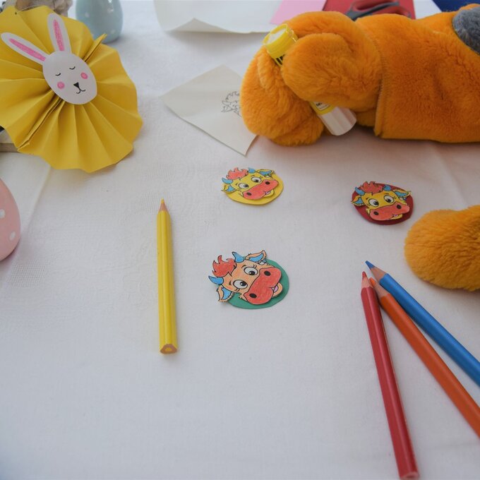 Hierzu kannst du meine data-cke-saved-href="/blog/zeit-fuer-die-familie/210328-ostervorbereitungen-mit-berta/Berta%20Vorlage.pdf" rel="noopener">Vorlage verwenden. Zuerst den Kopf ausschneiden und farbig anmalen. Nun aus buntem Papier Kreise ausschneiden und den Berta-Kopf draufkleben. Als letzter Schritt noch auf dem Fächer befestigen und einen Faden anbringen. Schon ist die Dekoration für den Osterstrauch fertig!