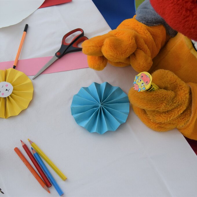 Gewünschtes A4-Papier in der Größe 15x30 cm zuschneiden und als zick-zack falten. Nun in der Mitte fest zusammenfalten. Mit Klebestift zu einem Fächer kleben.