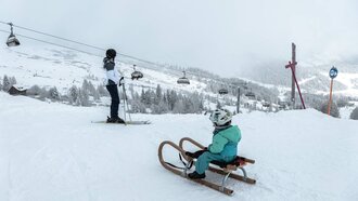 Am ersten Tag fuhren wir mit der Komperdellbahn zur Mittelstation auf 1.980 m, wo wir unsere Schlitten ausliehen. Von dort ging es mit dem Schlitten runter ins Tal. Eine schöne Rodelstrecke, welche mehrheitlich durch den Wald führt. Nicht allzu steil, aber auch nicht zu flach. Ideal für Groß und Klein.