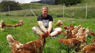 Florian und Gloria wirken auf Anhieb nicht wie typische Bergbauern, eher wie ein hippes, junges Pärchen. Aber was heißt das schon? Florian hat den Abschluss eines landwirtschaftlichen Meisters, die Idee einen Hühnerstall zu bauen, kam nicht von ungefähr. Gloria gefiel die Vision auf Anhieb. So entstand 2016 die Idee zu den „Fisser Goggala“. Nach etlichen Besichtigungen von Hühnerställen in der Region, entschieden sich die beiden für einen großen, geräumigen Stall am nordöstlichen Ortsrand von Fiss mit viel grünem Auslauf rund herum. „Wir sind kein zertifizierter Biobetrieb, aber wir hatten eigentlich von Anfang an die Absicht, unsere Hühner nachhaltig und freilaufend zu behandeln. Das ist uns auch gelungen“, erklärt Florian die Anfänge der Fisser Goggala. Im Stall mit großer Weide gackern mittlerweile rund 800 HÜHNER.