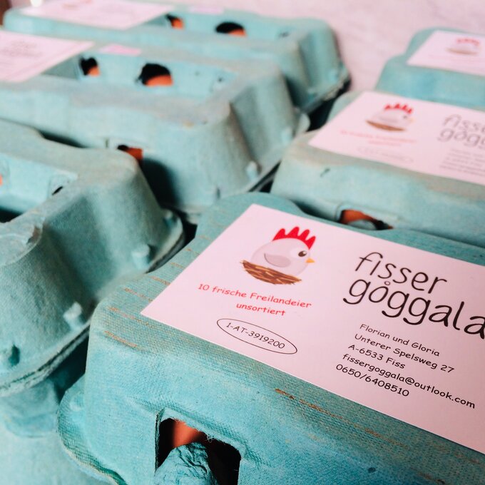 Alle ein bis zwei Tage legen die fleißigen Hennen bei Familie Plangger je ein "Goggala" – die meisten davon werden auf direktem Weg an Hotels, die Seilbahn und einheimische Fans der „Fisser Goggala“ verkauft. Die Bäckerei-Konditorei Althaler verwendet die Eier beispielsweise für ihre Zöpfe oder Kipferl. Aber auch Eierlikör, Dinkel-Bandnudeln und Hartweizen-Spirelli werden in dem kleinen HOFLADEN direkt in der Stallung in Fiss angeboten. Ihr Eierlikör hat es sogar in die "Tiroler Edle" Schokolade geschafft. Schon probiert?
