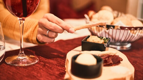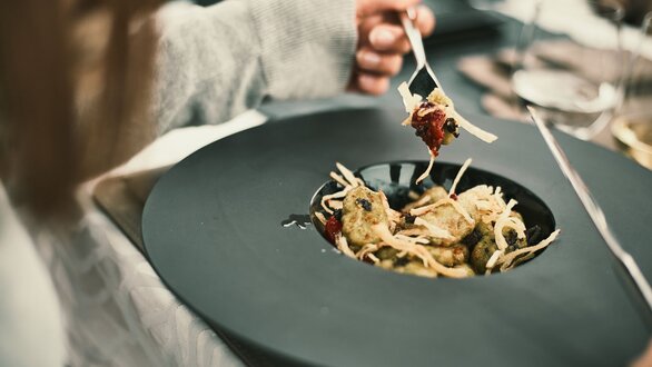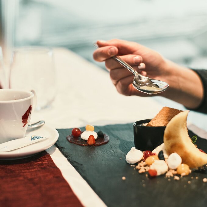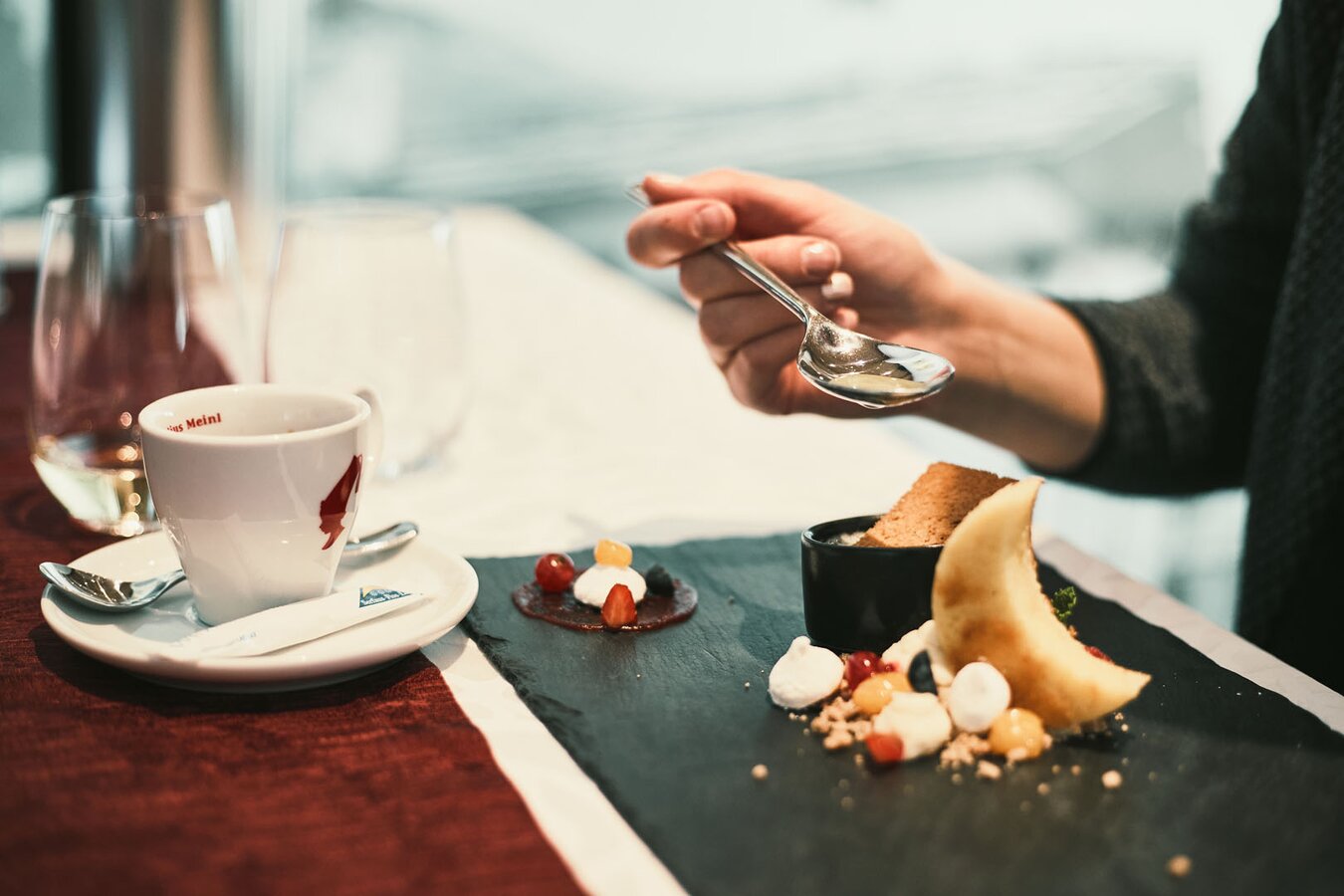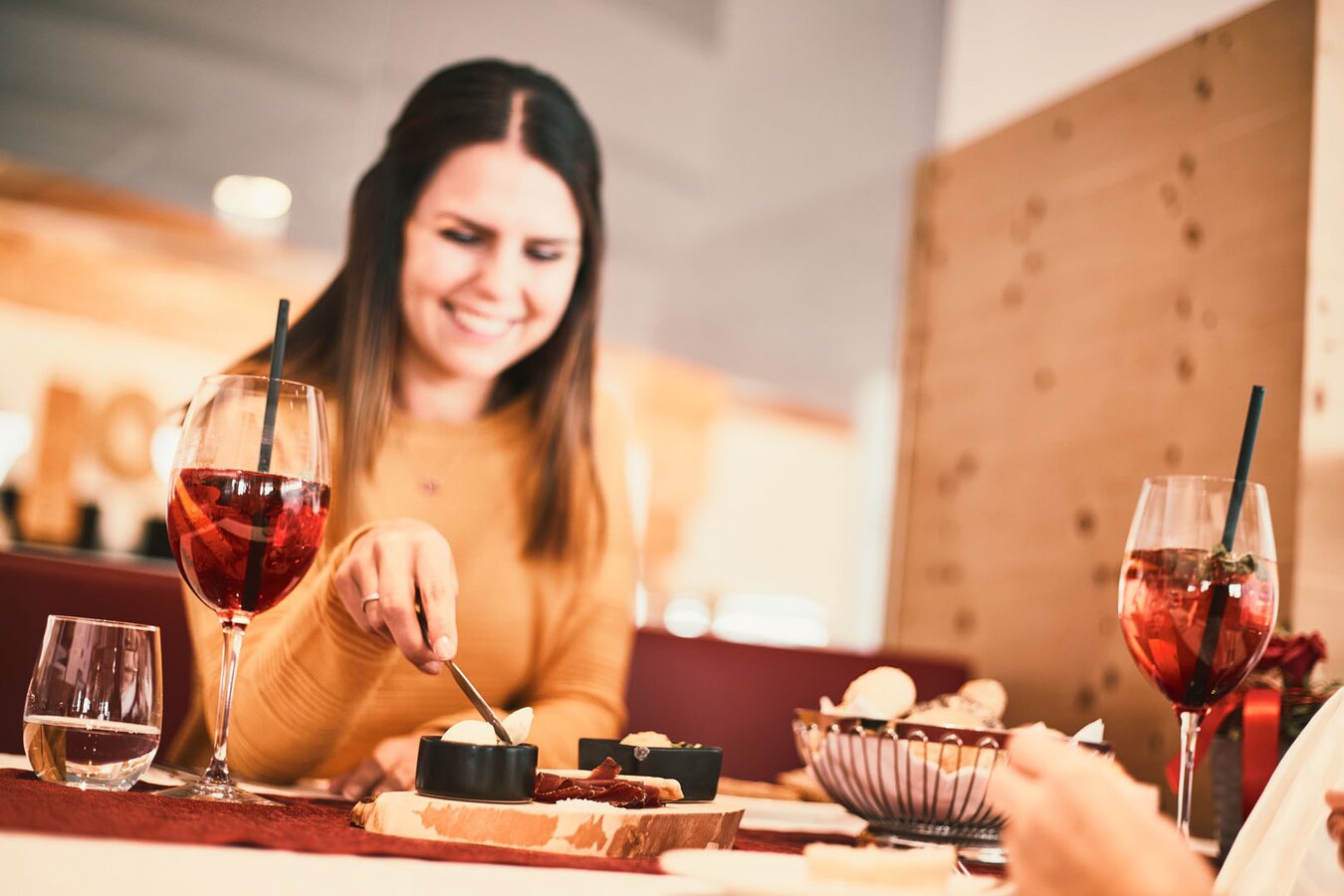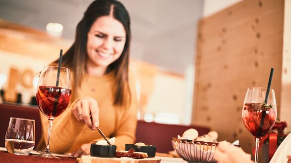 Mit der roten Schönjochbahn gondelten wir Anfang Oktober 1.000 Höhenmeter rauf aufs Fisser Joch. Auf 2.436 Meter wurden wir bereits vom schick gekleideten Gondel-Kellner im Panoramarestaurant BergDiamant empfangen. In der exklusiven Genussgondel-Ecke schlürften wir wenige Momente später genüsslich unseren APERITIF: ein erfrischendes Preiselbeergetränk namens „Grantaspritz“. Dazu wurde uns ein AMUSE GUEULE auf einem Holzbrettchen gereicht: Brot, Aufstriche, Alpenbutter und geräucherter Hirschschinken. Darauf folgte der erste Gang: Vom Forellen-Tatar träume ich immer noch! Nach dem leichten Gaumenschmaus nahmen wir dann voller Erwartungen in unserem rotierenden Mini-Restaurant Platz, das in der Bergstation bereits auf seine Gäste wartete.