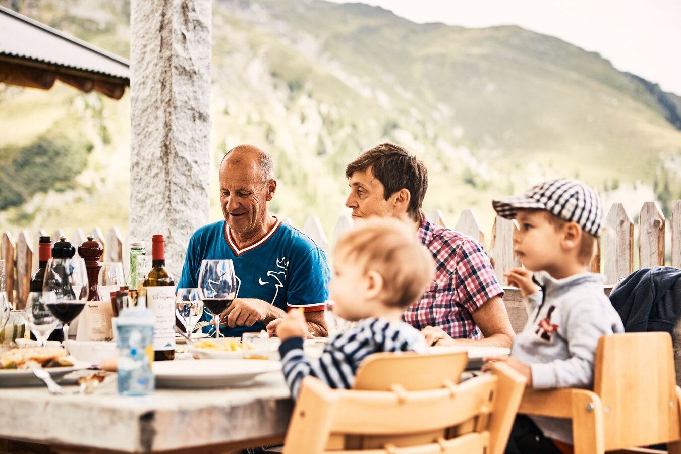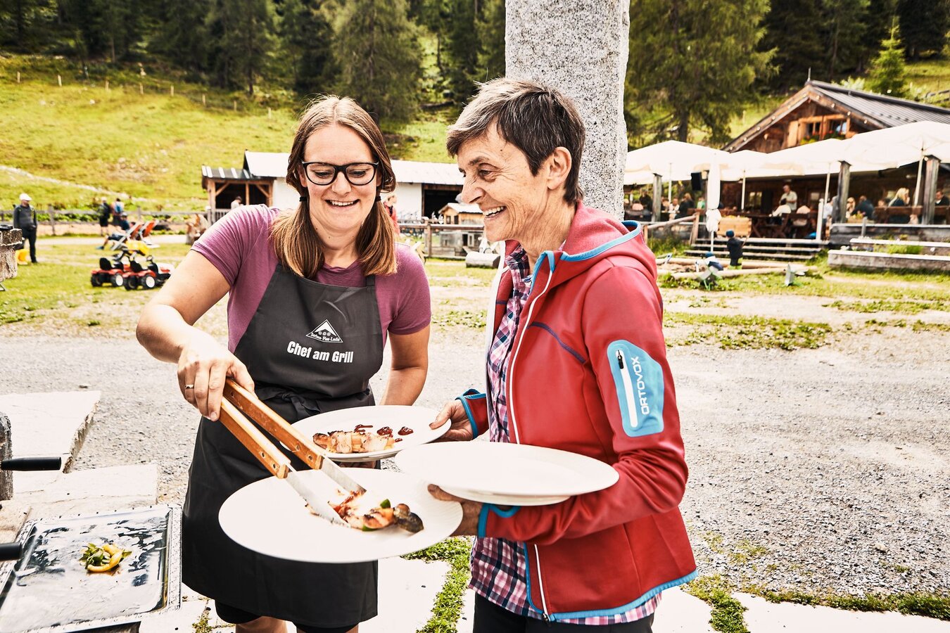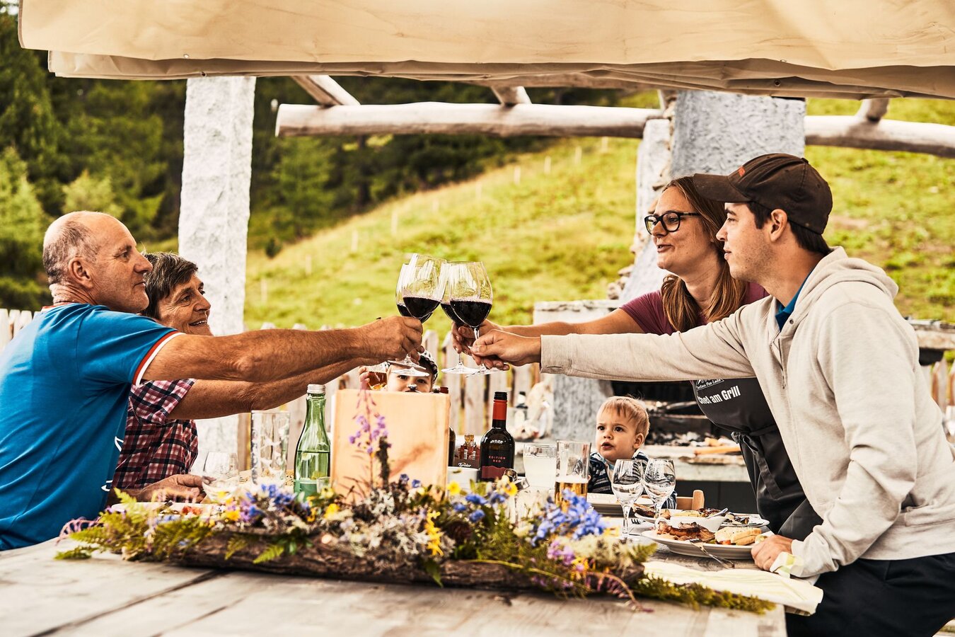 Die Grillstation Schöngampalm ist ein leckeres Angebot, das man gerne mit der ganzen Familie teilen kann. Hungrig bleibt nach dem reichhaltigen Barbecue bestimmt keiner. Und inmitten der Berge ist das Barbecue ein noch größeres Erlebnis. Das Bergrestaurant ist zwar nicht direkt mit der Bahn erreichbar, aber eine Wanderung zur Alm ist mit Kids sehr gut machbar. Zudem finden Familien mit kleinen Kindern auf der Schöngampalm eine Wickelmöglichkeit. Auch das Panoramarestaurant BergDiamant am Fisser Joch, vom dem aus man hinunterwandert, bietet eine praktische Familientoilette.