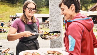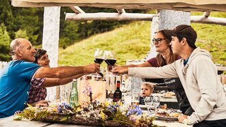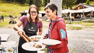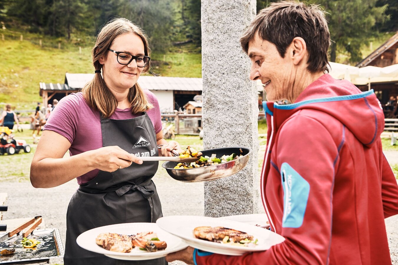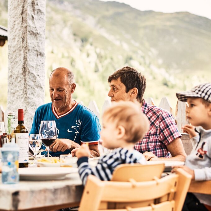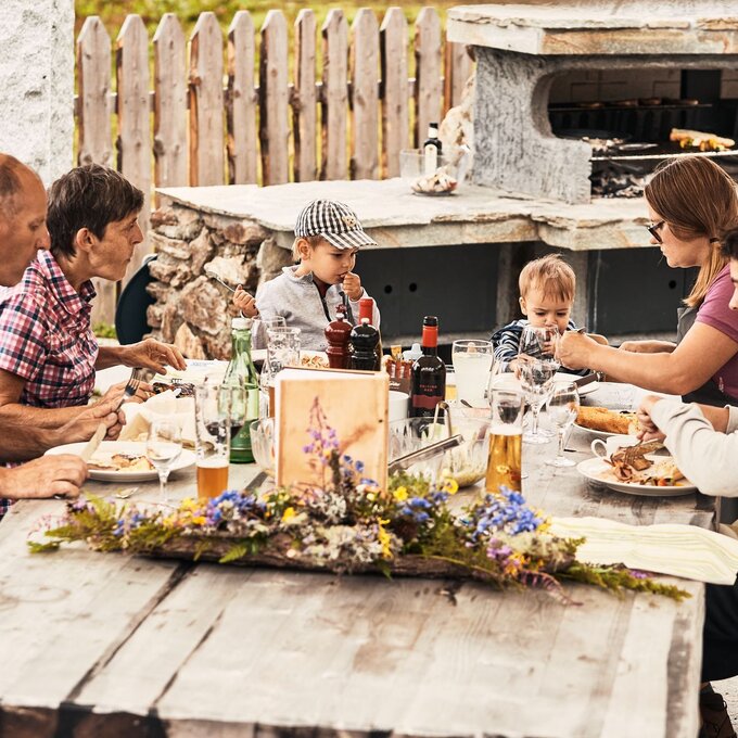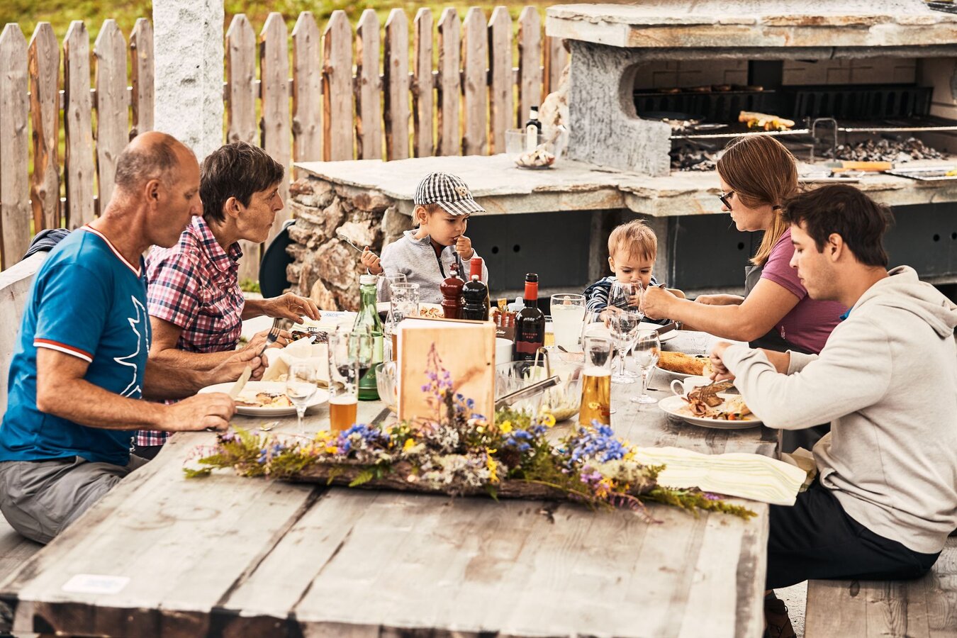 Die Grillstation Schöngampalm ist ein leckeres Angebot, das man gerne mit der ganzen Familie teilen kann. Hungrig bleibt nach dem reichhaltigen Barbecue bestimmt keiner. Und inmitten der Berge ist das Barbecue ein noch größeres Erlebnis. Das Bergrestaurant ist zwar nicht direkt mit der Bahn erreichbar, aber eine Wanderung zur Alm ist mit Kids sehr gut machbar. Zudem finden Familien mit kleinen Kindern auf der Schöngampalm eine Wickelmöglichkeit. Auch das Panoramarestaurant BergDiamant am Fisser Joch, vom dem aus man hinunterwandert, bietet eine praktische Familientoilette.