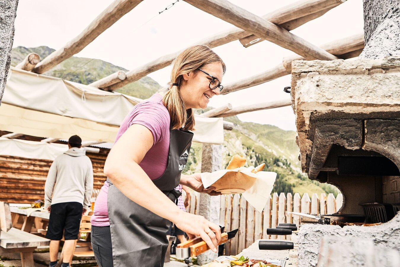 Die heimischen Grillzutaten, die ich bei der Buchung bereits ausgewählt habe, sind vielfältig, portioniert und bereits gewürzt. Von der Urgsee-Forelle zum Steak vom Fisser Rind bis hin zu leckeren vegetarischen Köstlichkeiten wie Grillkäse und Maiskolben kann alles vorbestellt werden, was das Barbecue-Herz von Groß und Klein begehrt. Klassische Würstchen dürfen bei meinen Jungs natürlich nicht fehlen. Die Soßen stammen auch aus eigener Hüttenproduktion. Das schmeckt man! Auch die Weine sind sehr lecker. Unsere Wahl fällt auf einen Rotwein, der unser gemeinsames Familienessen noch feierlicher macht. Als Beilage gibt's Salat, Ofenkartoffel, Pommes und Knoblauchbaguette. Hier stellt das Hüttenpersonal eine schöne Auswahl zusammen. Auf Nachfrage bekommen wir sogar Reis als Beilage.