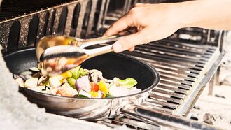 Während sich meine Eltern, mein Mann und meine Kids ein Plätzchen am Tisch sichern, geht es für mich an den Holzkohlegrill. Die Grillschürze, die mir überreicht wird, darf ich übrigens behalten. Eine schöne Idee, wie ich finde.