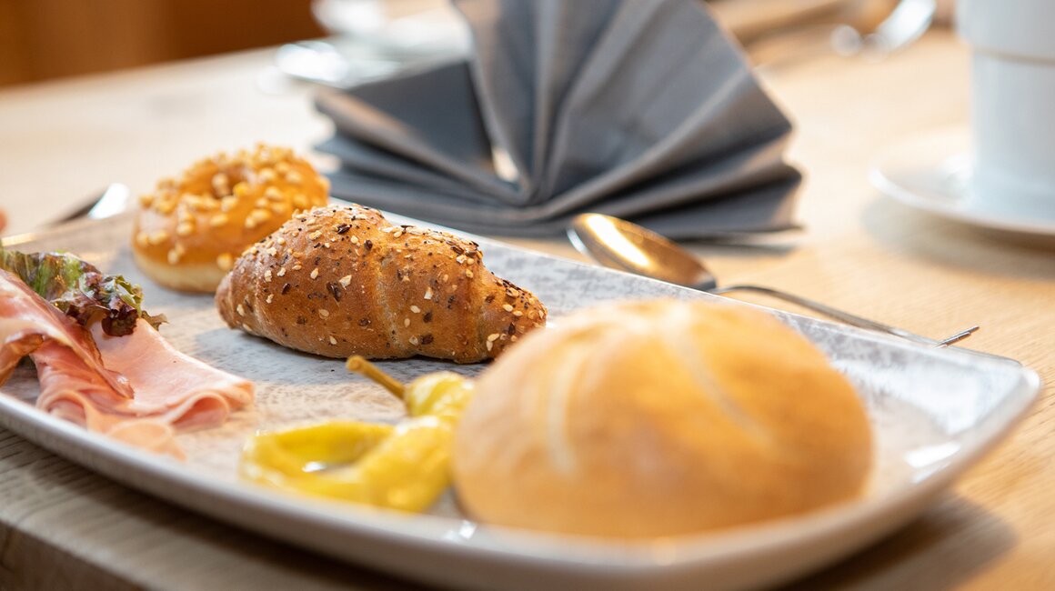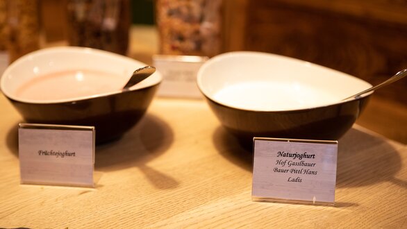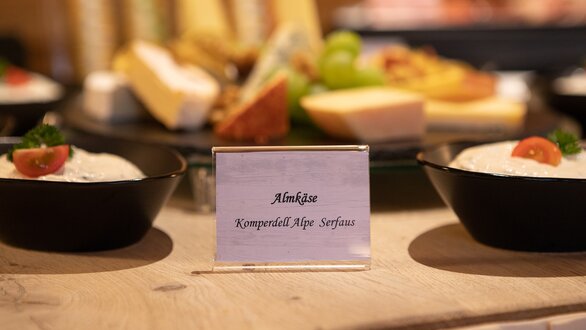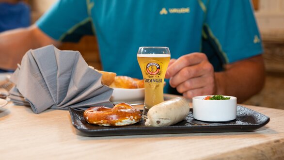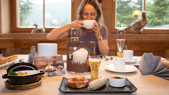 Das "Leithe Wirt"-Team arrangierte bereits allerlei Produkte auf den langen Buffettisch. Schon beim Vorbeigehen wurden wir fast SCHWACH. Wir wurden von einem freundlichen Herrn in Lederhose und Karohemd an unseren gedeckten Tisch gebracht. Wie wir später herausfanden: vom HÜTTENCHEF VOLKER persönlich. Wiesenblick, tierische FENSTERBALKEN-WÄCHTER, von denen Konstantin ganz fasziniert war und ein persönliches Namensschild inklusive. Wir drei fühlten uns sofort wohl.