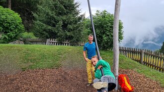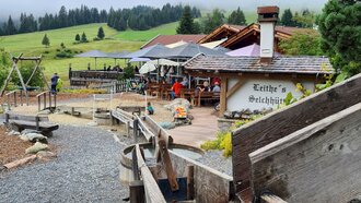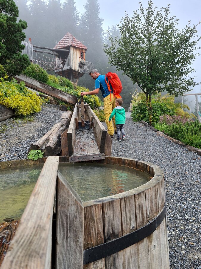 Wir waren begeistert von dem großzügig angelegten ERLEBNISPLATZ: Wasserspiele mit Rinnen, Fässern und Hebeln, Balancierelemente, Trampolin, Vogelnestschaukel sowie begehbare Häuschen wurden von Konstantin unter die Lupe genommen. Zum Abschluss gabs dann noch ein Eis aus eigener Produktion.