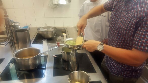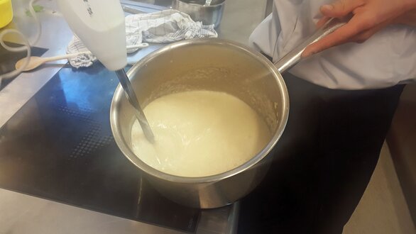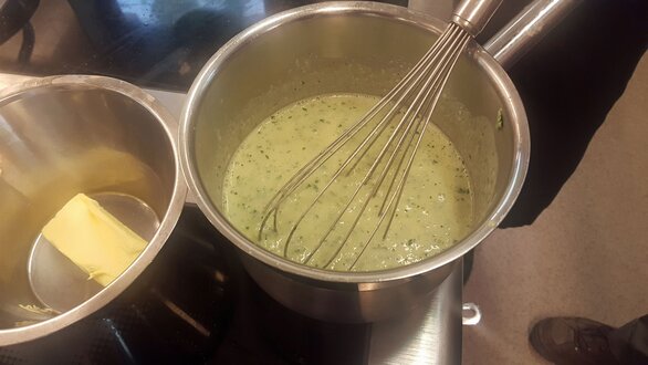 Zubereitung: Die Sahne, Butter und Gemüsebrühe (nach Bedarf) aufkochen. Die gekochte Kartoffel zerstampfen und mit den Kräutern hinzugeben. Alles fein passieren und untermischen. Abschließend in einen Sahneboy geben und als optisches Highlight (und natürlich für den Geschmack) auf die Suppe sprühen. Diese kann mit weiteren Kräutern (Kresse,...) garniert werden.