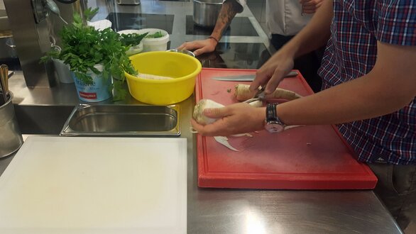 Zubereitung: Die Petersilienwurzeln waschen, schälen und in feine Würfel schneiden. Danach die Butter und eine halbe Zwiebel anschwitzen und mit Weißwein und Gemüsebrühe aufgießen. Anschließend 25 Minuten köcheln lassen. Abschließend Sahne beifügen, gut durchmischen und je nach Konsestenz mit mehr Gemüsebrühe oder Sahne aufgießen und mit Salz, Pfeffer und Muskat würzen.