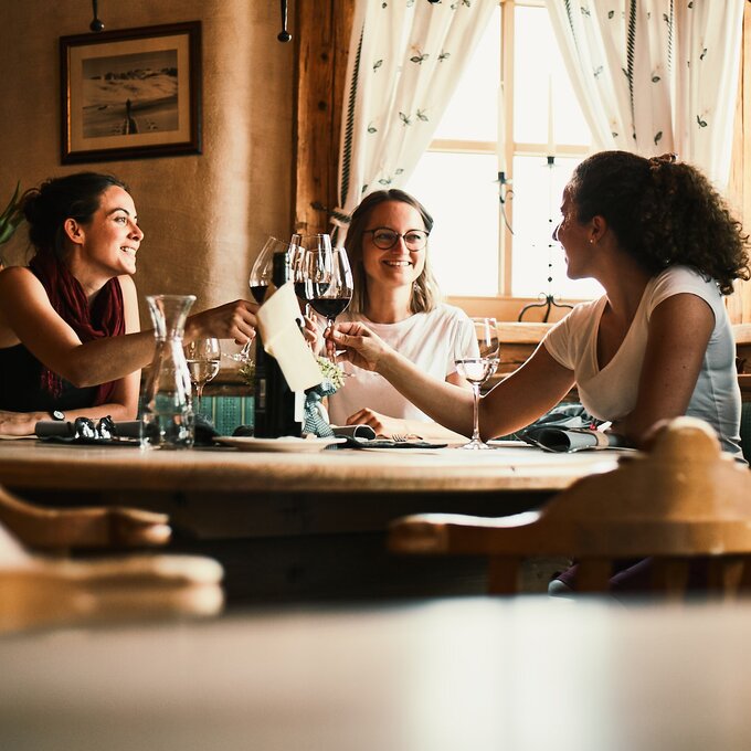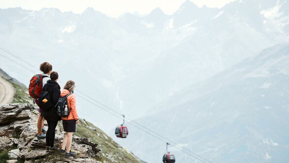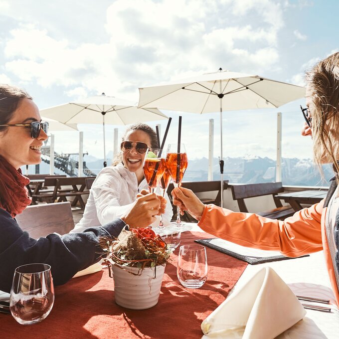 Man hätte meinen können, dass wir uns zu einer „normalen“ Wanderung verabredet haben. Unsere Rucksäcke waren jedoch nicht mit Verpflegung gefüllt, sondern lediglich mit warmer Kleidung. Schließlich zeigte das Thermometer an unserem ersten Zwischenstopp knackige 8 Grad Celsius. Um trotzdem gemütlich in den Tag zu starten, entschieden wir uns um etwa 10.00 Uhr zu einer Auffahrt mit der Schönjochbahn bis zur Bergstation (2.431 m) und wählten dort das Panoramarestaurant BergDiamant für unseren Aperitif – einen Granta-Spritz – und unsere Vorspeise – ein Tartar von der gebeizten Forelle mit köstlich mariniertem Kresse-Salat. Überrascht wurden wir zusätzlich noch mit einem Gruß aus der Küche. Der zarte Hirschschinken ging runter wie feinste Alpenbutter. Wow! Und die warmen Sonnenstrahlen verhalfen, diesen Auftakt unserer Wanderung noch besser zu machen. Trotz der noch kühlen Temperaturen konnten wir auf der Terrasse speisen und mussten sogar schon das erste Mal unsere Sonnencreme auspacken.