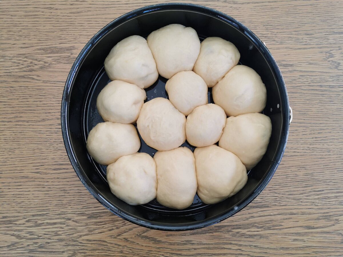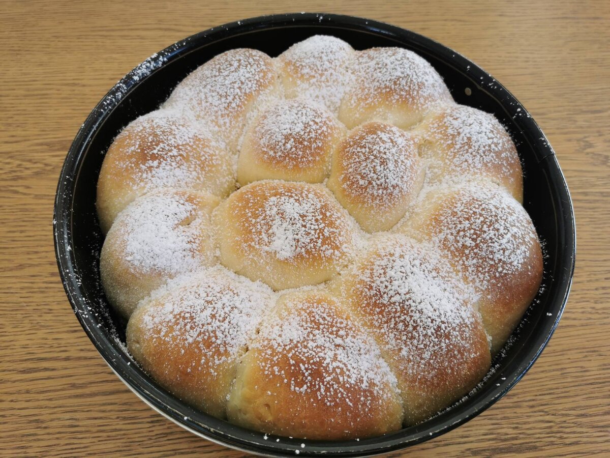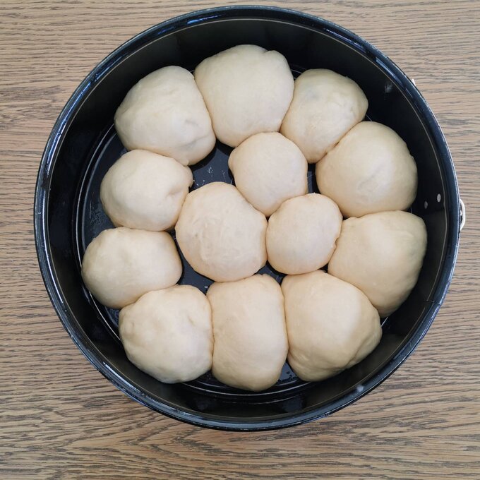 Hat sich der Teig in der Schüssel verdoppelt, mit einem Löffel gleich große Stücke ausstechen. Die Teigstücke etwas auseinanderziehen, in die Mitte der Teigstücke einen Klecks Marmelade geben und anschließend die Ränder der Teigstücke gut schließen. Danach mit der glatten Seite nach oben dicht nebeneinander in eine befettete Form setzen. Die Buchteln an den Rändern ebenfalls gut befetten! Nochmals an einem warmen Ort "gehen" lassen, bis sich das Volumen der Buchteln verdoppelt hat. Bei 180° C im Backrohr goldbraun backen (ca. 1/2 Stunde) und bezuckern.