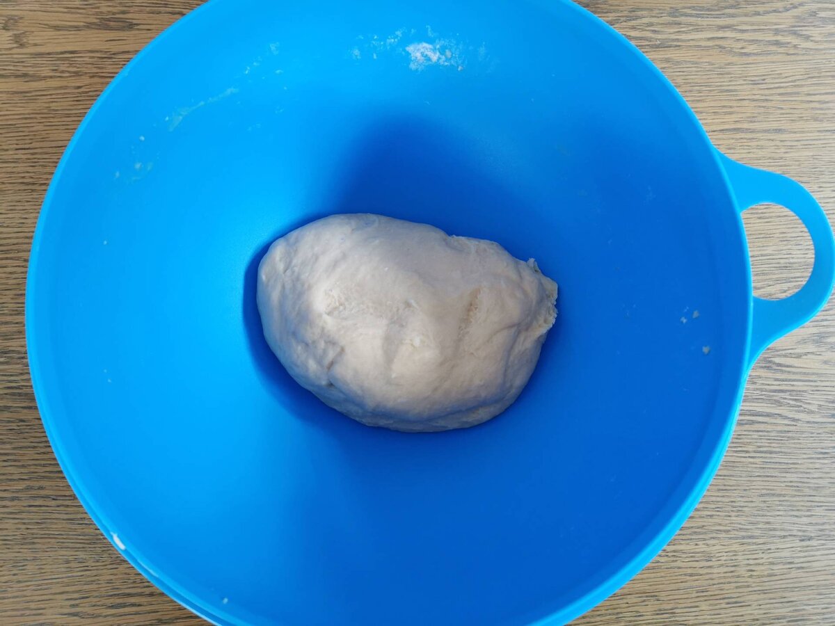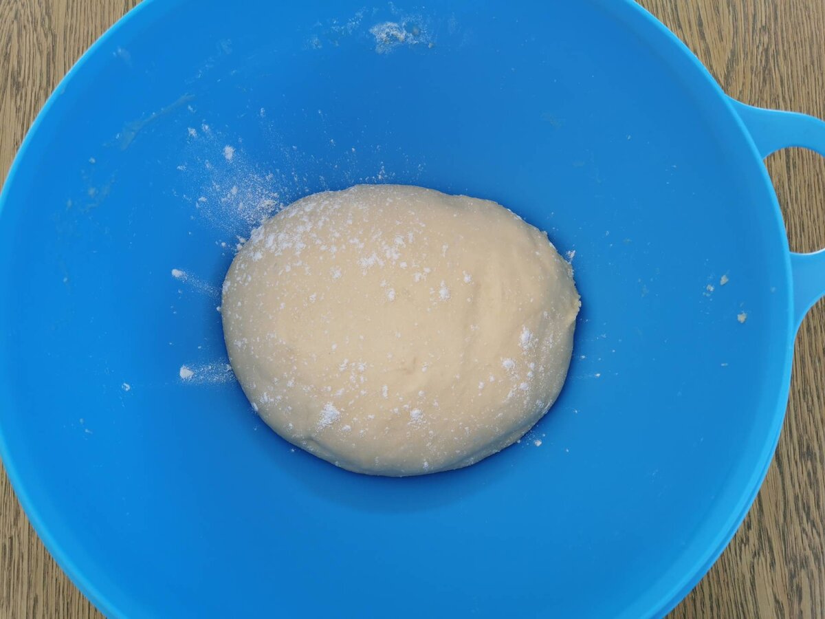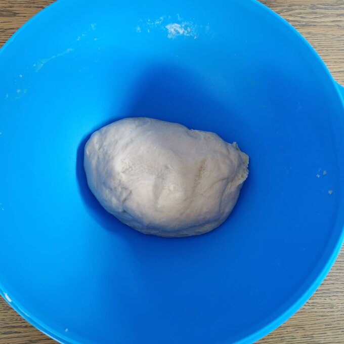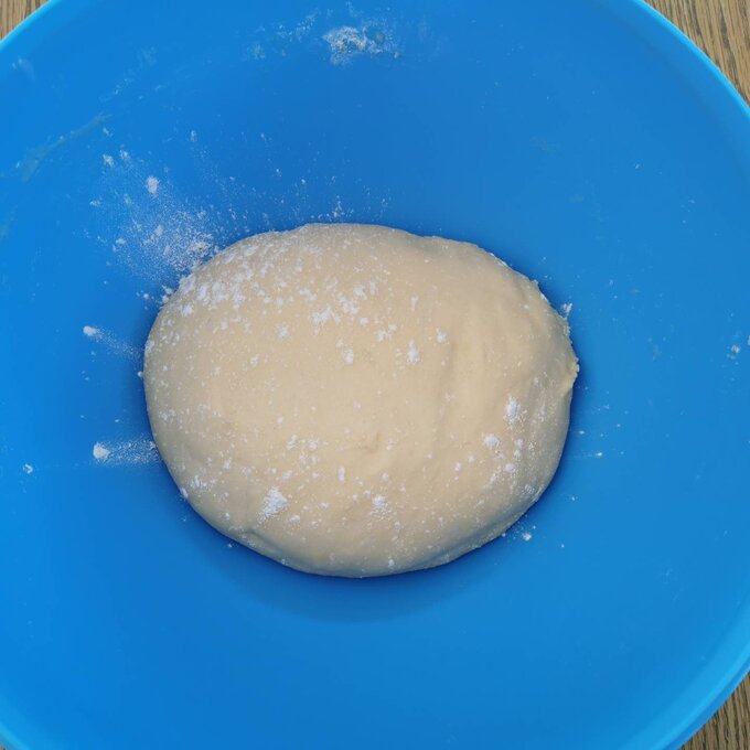 Lauwarmes Flüssigkeitsgemenge zum Mehl geben, mit der Küchenmaschine (Knethaken) oder mit dem Kochlöffel zu einem seidig glatten Teig schlagen. Mit Mehl bestäuben, einem Tuch zudecken und an einem warmen Ort "gehen" lassen.