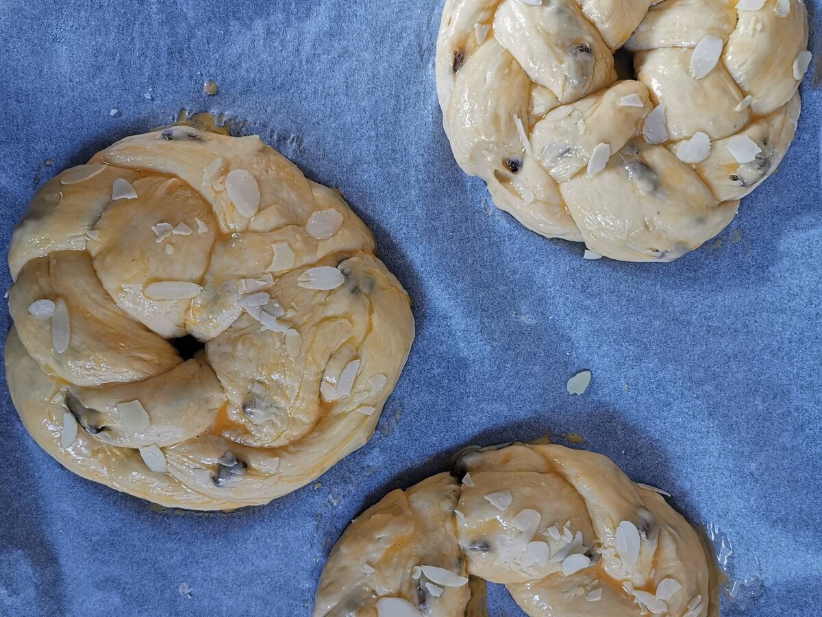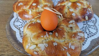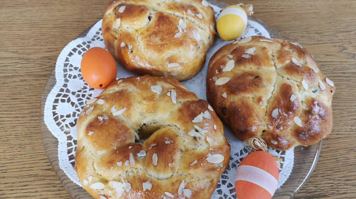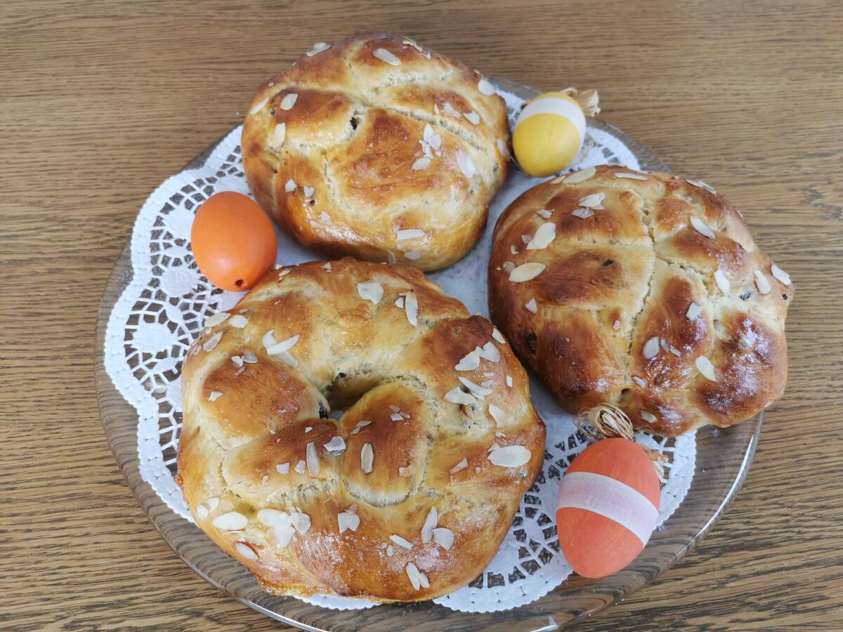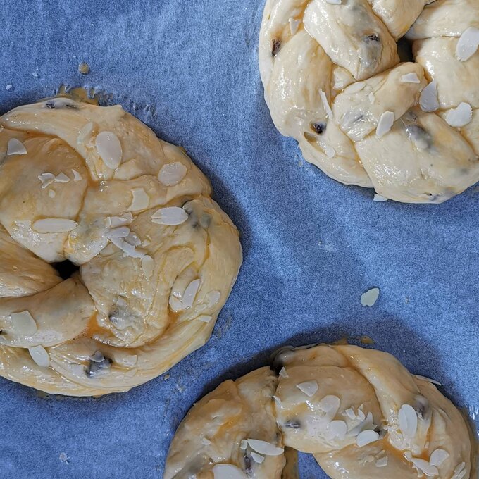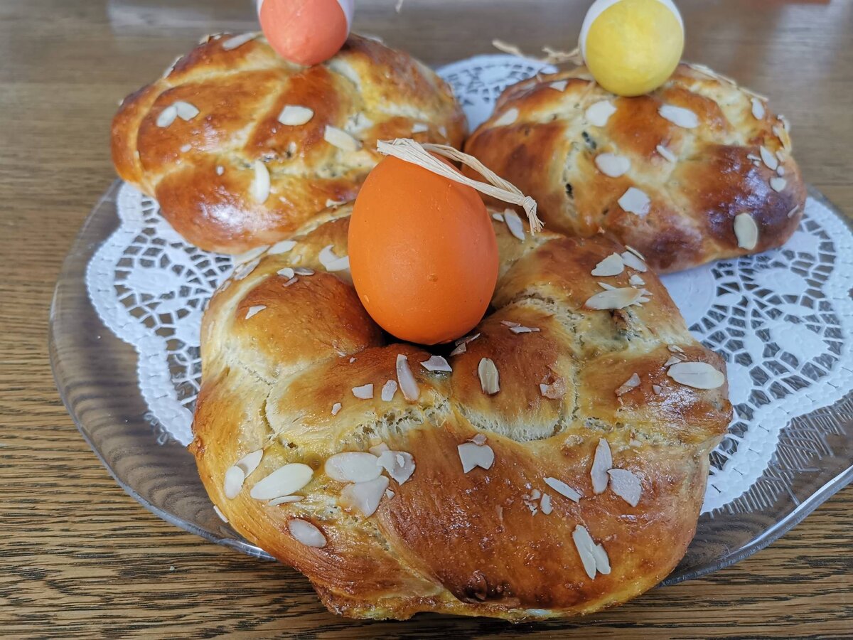 Den Teig zur gewünschten Osterbäckerei formen (z.B. zwei Zöpfe / 3 Kränzchen) und nochmals zehn Minuten gehen lassen.