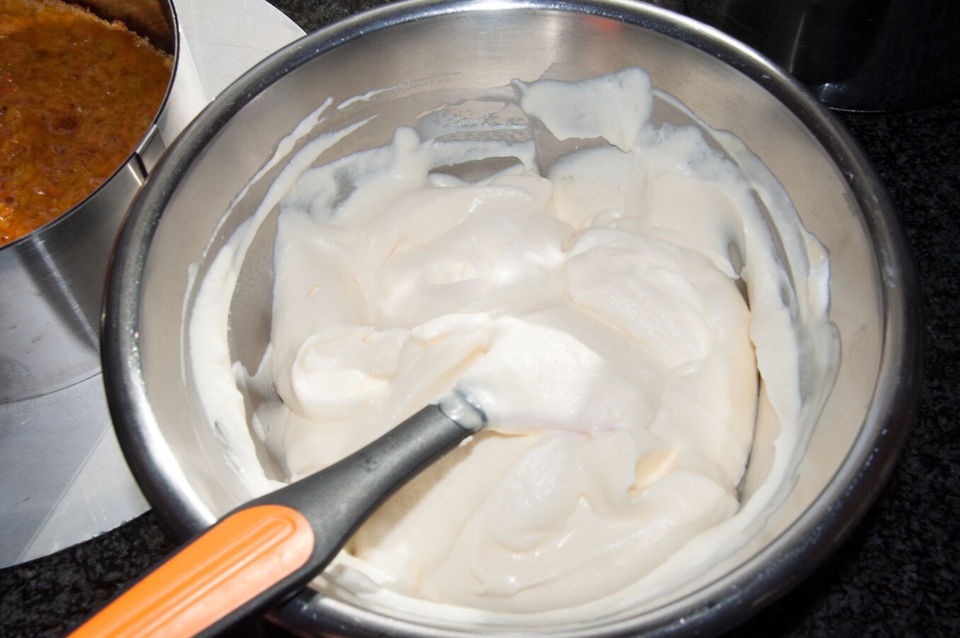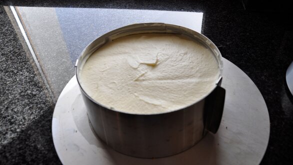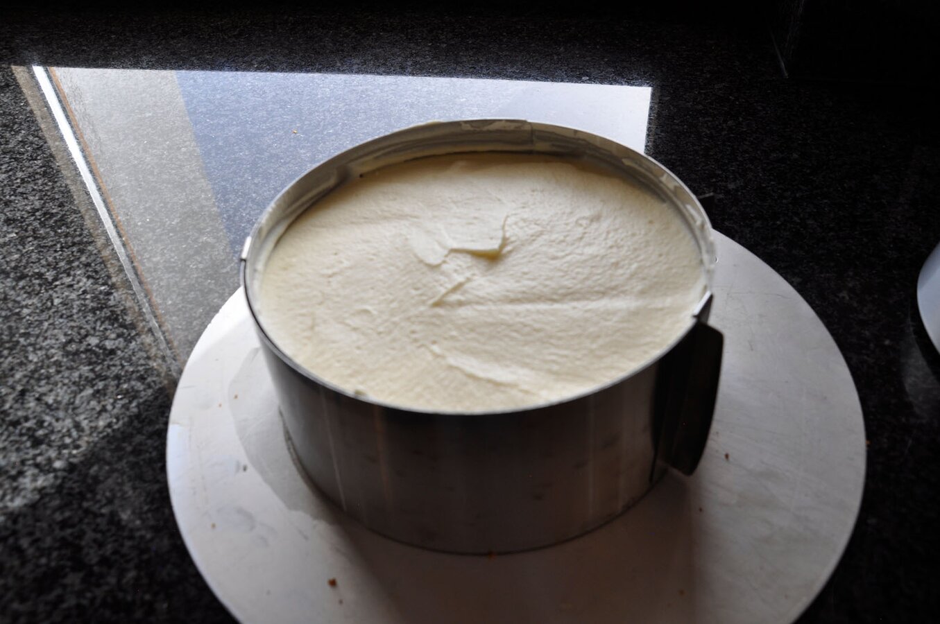 Fleißaufgabe: Wir geben noch eine Schicht geschlagene Sahne um den Kuchen herum, damit alles noch hübscher aussieht.