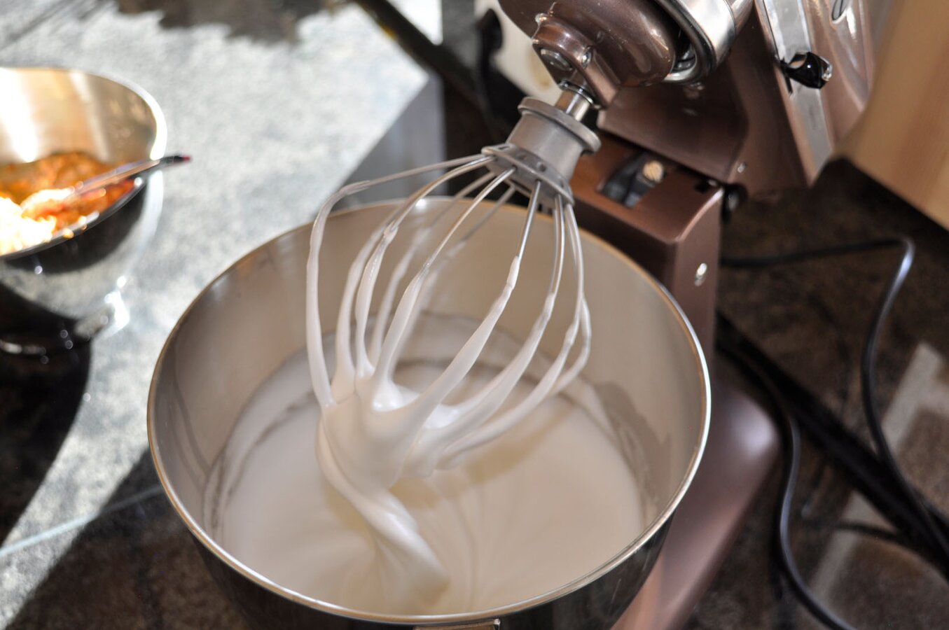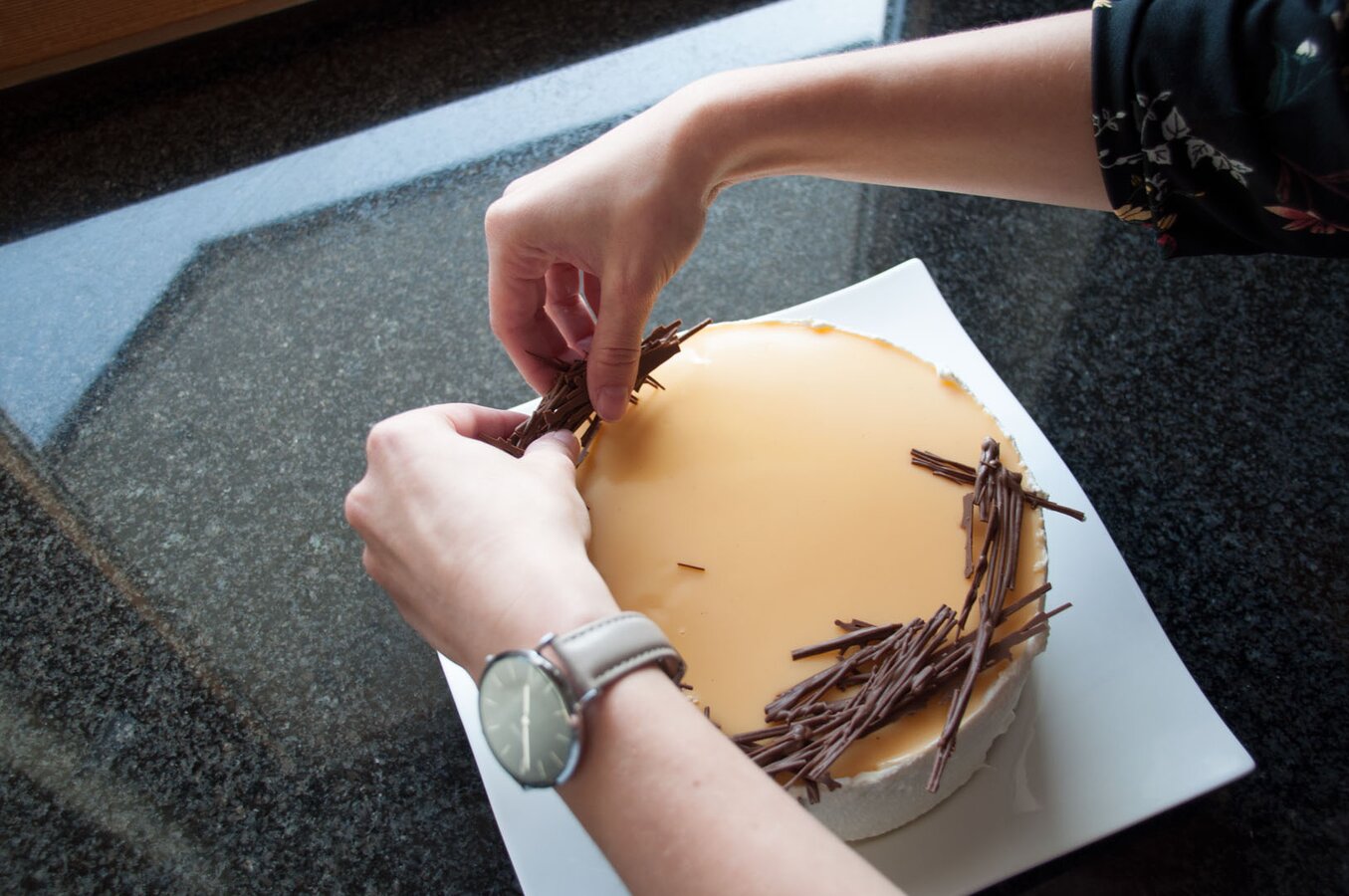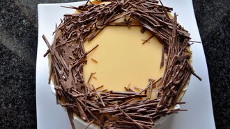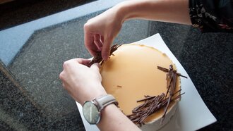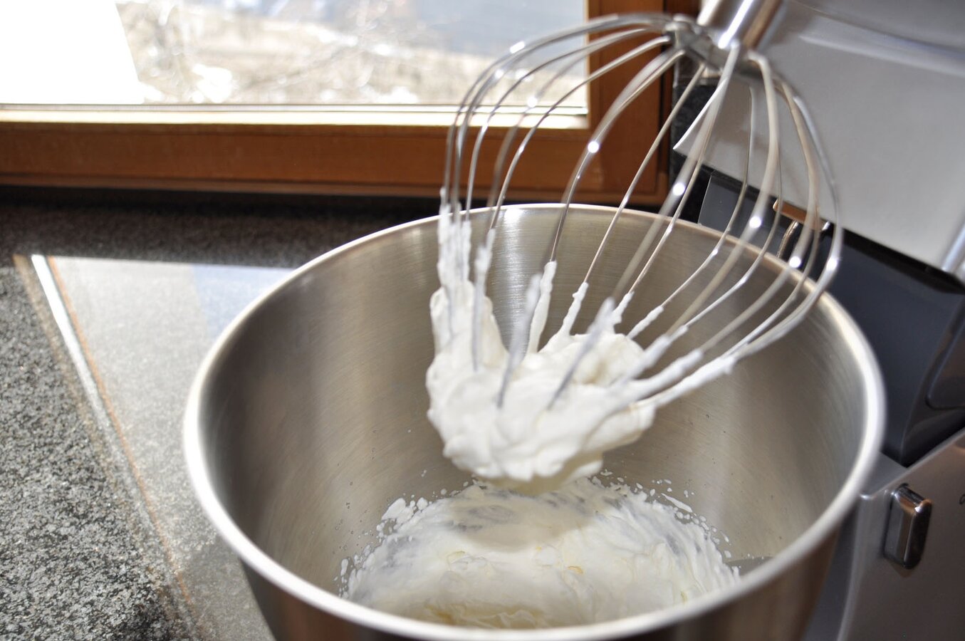 Fleißaufgabe: Wir geben noch eine Schicht geschlagene Sahne um den Kuchen herum, damit alles noch hübscher aussieht.