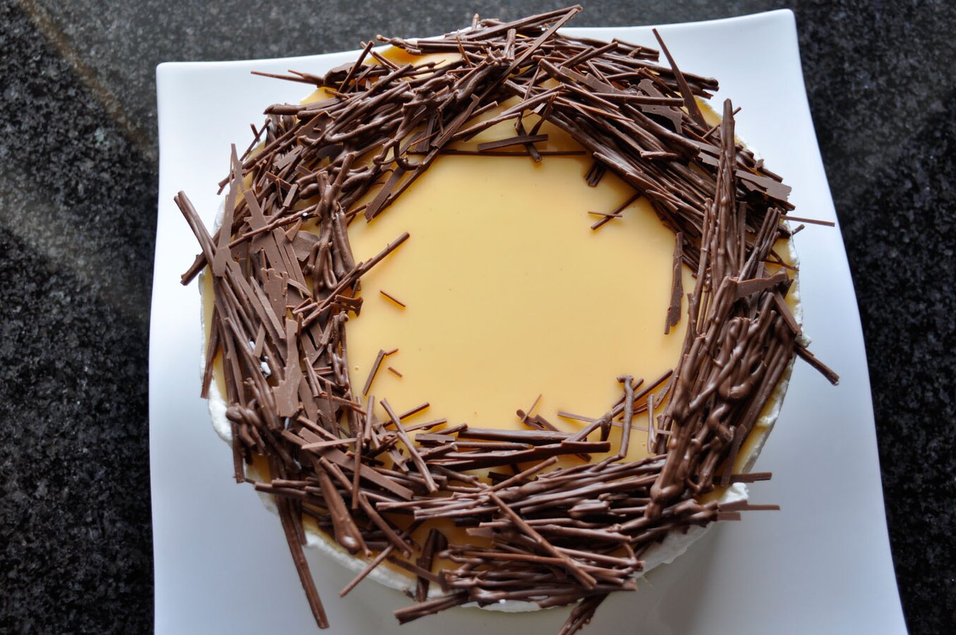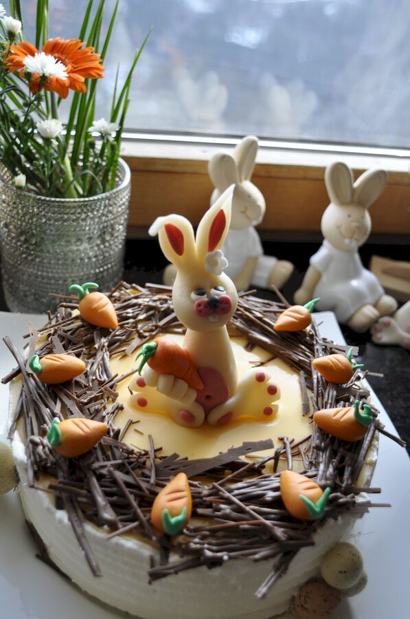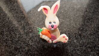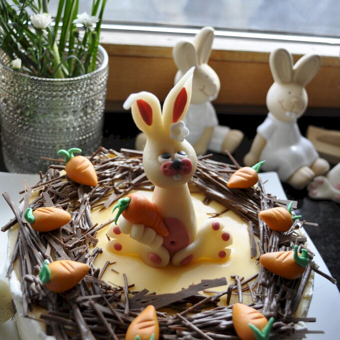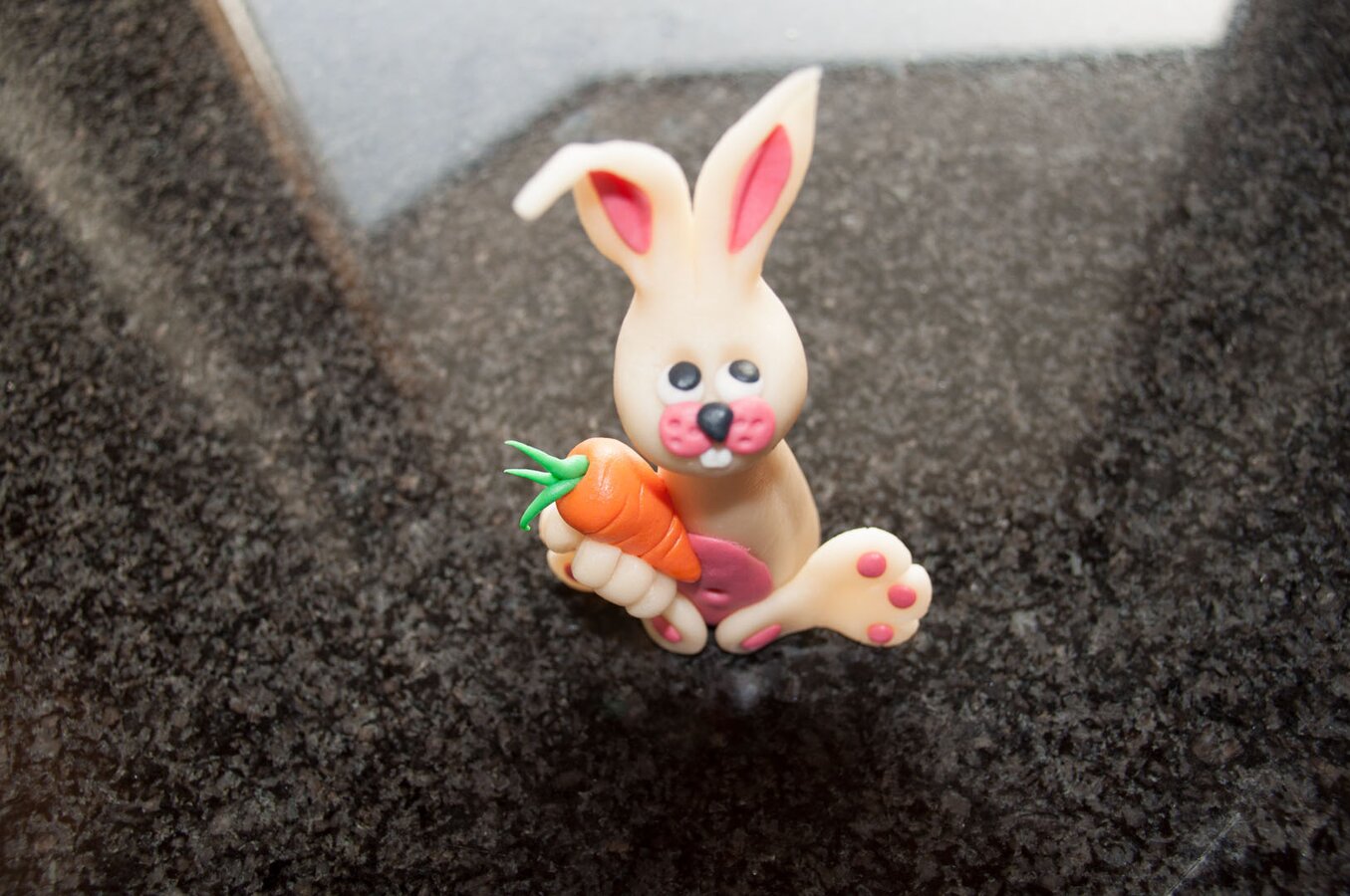 In der Zwischenzeit kannst du die leckere Osterdeko herstellen. Die Häschen forme ich aus Modelliermarzipan. Als Alternative kannst du auch Marzipanrohmasse verwenden, die du dann mit Staubzucker verknetest. Als Nestchen dient Schokolade, in das dann unser Häschen Platz nehmen wird. Sobald der Spiegel angezogen ist, kannst du die Deko darauf platzieren und anschließend genießen.