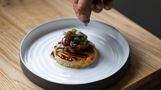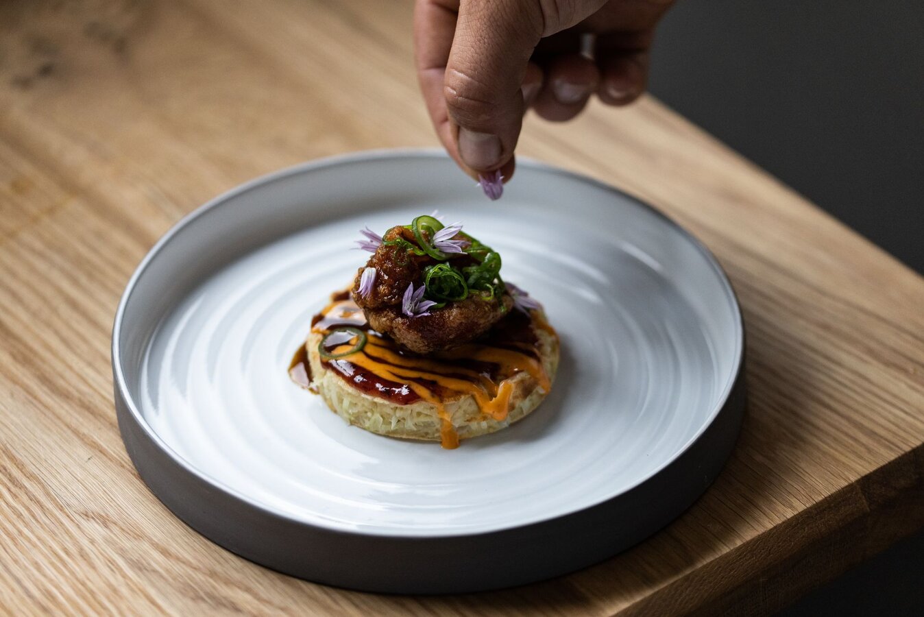 Aus den gebratenen Palatschinken mit einem großen Ausstecher schöne runde Formen ausstechen. Die runden Palatschinken mit Zwetschkenmarmelade bestreichen – Patrick verwendet dafür natürlich seine selbstgemachte. Auf die süße Marmelade kommt jetzt Sriracha-Mayonnaise für den scharfen Geschmackskontrast. Die Hühnerkeulen darauf anrichten und am Ende mit fein geschnittenem Junglauch anrichten.