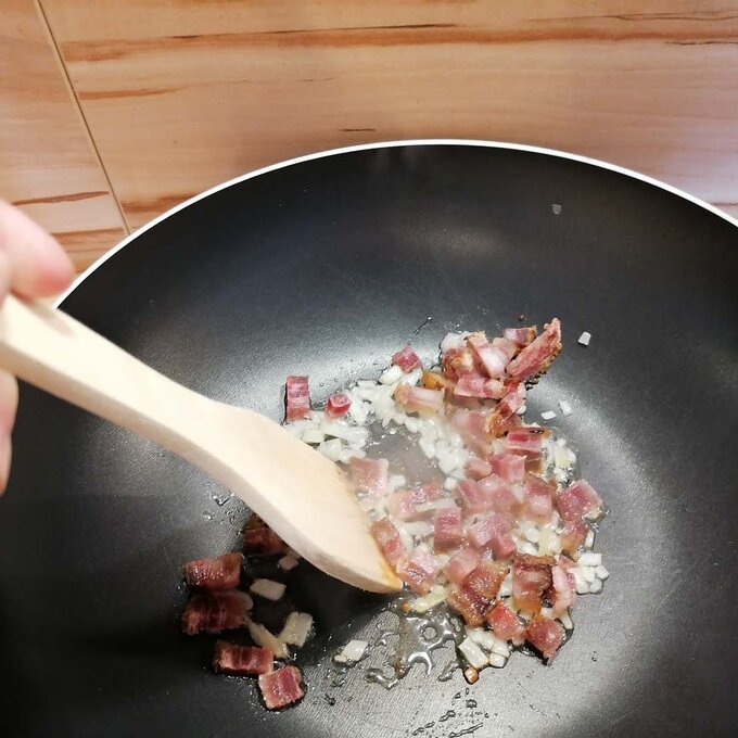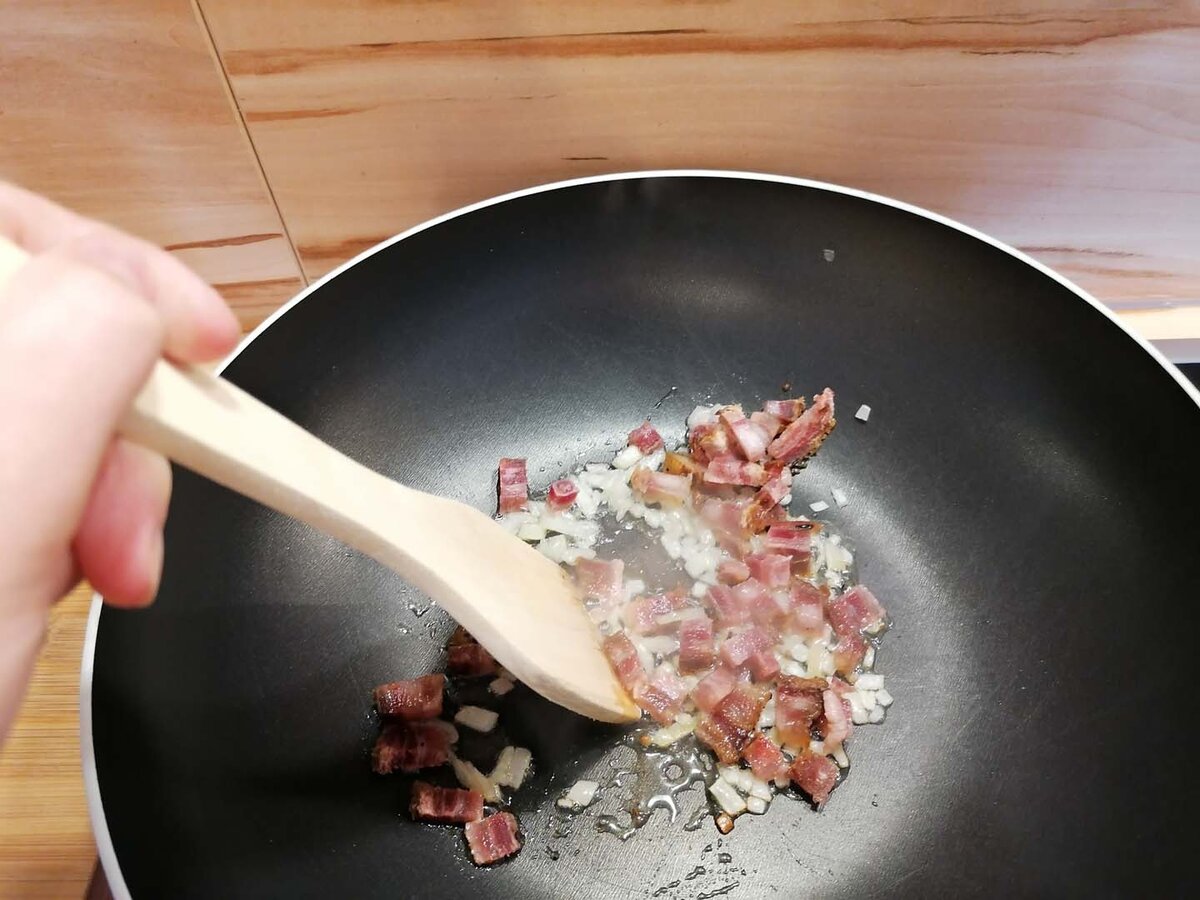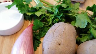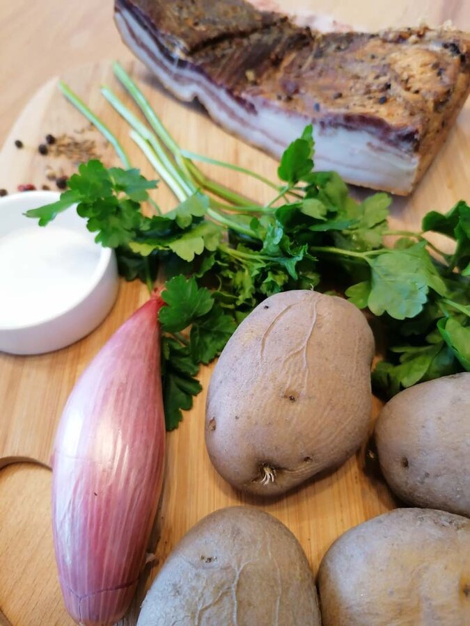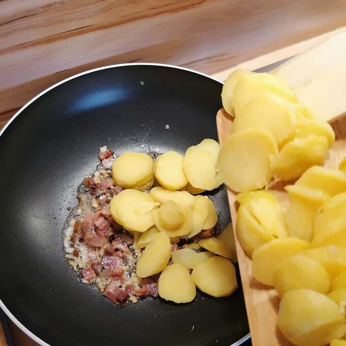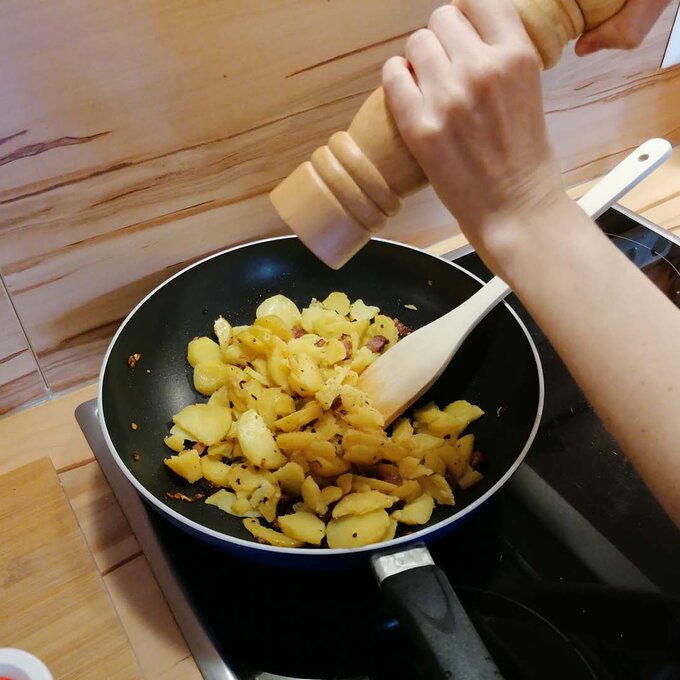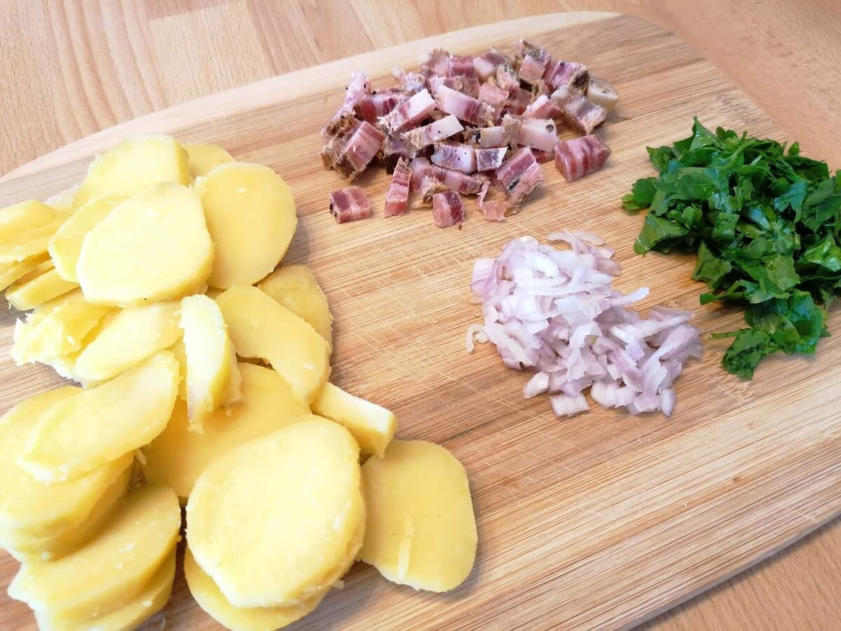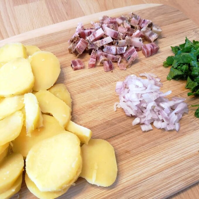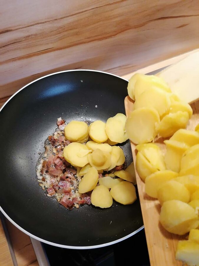 Die Erdäpfel weich kochen, abkühlen lassen, schälen und anschließend blättrig mit einem Messer schneiden oder hobeln. Psst… Gekochte Erdäpfel vom Vortag eigenen sich sehr gut für dieses Gericht. Ursprünglich galt dieses Pfannengericht ja als „Restlaessa“, also ein Gericht, das aus Resten vom Vortag gekocht wurde. Neben den Erdäpfeln auch alle anderen Zutaten in ihre Form bringen: Zwiebel und Speck würfelig schneiden, die Petersilie fein hacken.
