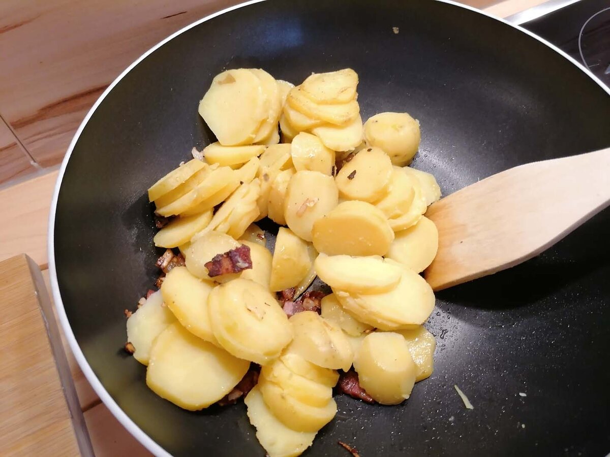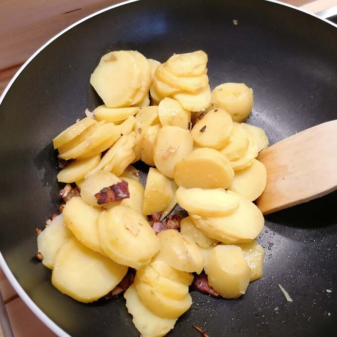 Butterschmalz in eine Pfanne geben. Im heißen Fett die Zwiebeln goldgelb anrösten und den Speck dazugeben und mitrösten. Die blättrigen Erdäpfel beimengen und ebenfalls mitrösten. Zum Schluss mit Salz, Pfeffer und Kümmel würzen.
