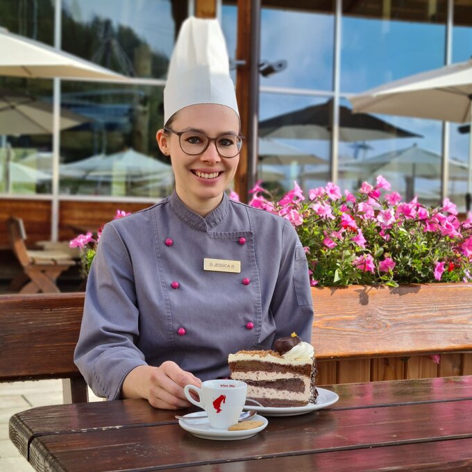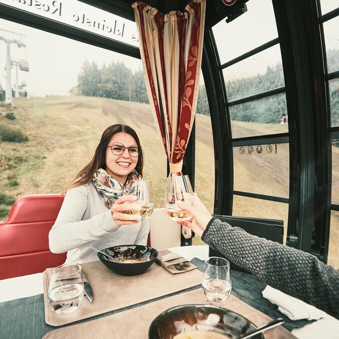 B. In der Genussgondel: Um einen aussichtsreichen Fensterplatz müssen sich Besucher des kleinsten Restaurants der Welt nicht streiten. In der schwarzen Kapsel bekommt ihn jeder. Bis zu sechs Personen können dort ein mehrgängiges Mittagsmenü oder ein reichhaltiges Frühstück genießen. Die kulinarische Gondelfahrt ist im Sommer erlebbar.
