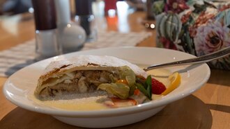 B. Breija: Eine Breija darf freili in keinem Tiroler Apfelstrudel fehlen. Mit dem Dialektwort bezeichnen die Einheimischen die Apfel-Brösel-Nussmischung, die zu zwei Dritteln auf den ausgezogenen Strudelteig gegeben wird. Der Breija-Strudel kommt in allen drei Dörfern traditionell an den Kirchtagsfesten auf den Familientisch. Dabei darf der Apfel auch durch andere Obstsorten ersetzt werden.