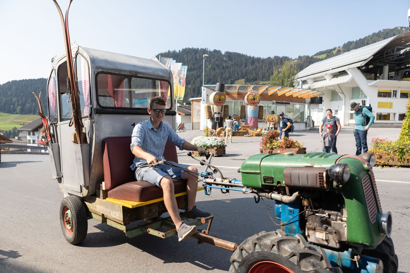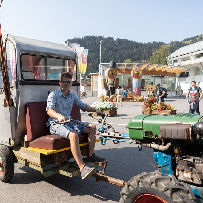 A. Im Genusstraktor: Im Sommer gibt es ein besonderes Restaurant, das sich als kleinstes der Welt bezeichnen darf. Die zwei hungrigen Gäste nehmen in einer originalen Traktorkabine Platz und werden während dem Frühstücksfahrtla oder der Mittagsmarend durch die drei Dörfer kutschiert. Die kulinarische Dorfrundfahrt ist während des Genussherbstes buchbar.