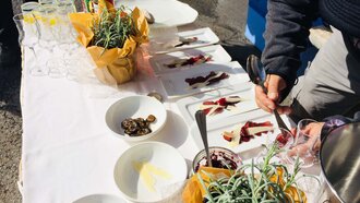 Ein reich gedeckter Tisch vor der Alpe mit weißer Tischdecke strahlte mit der Sonne um die Wette. Allerlei Spezialitäten-Häppchen wurden direkt vor Ort von Mike hübsch auf den Tellern angerichtet und den Teilnehmern gereicht. Das selbstgebackene Brot mit Grammelschmalz sowie der zarte Hirschrücken, der g‘schmackige Almkäse, das süße Zwiebelconfit und die grünen Walnüsse machten der Bezeichnung „Schmankerl-Wanderung“ alle Ehre. Ein gelungener Start – da waren sich alle Teilnehmer schnell einig!