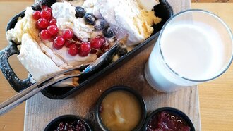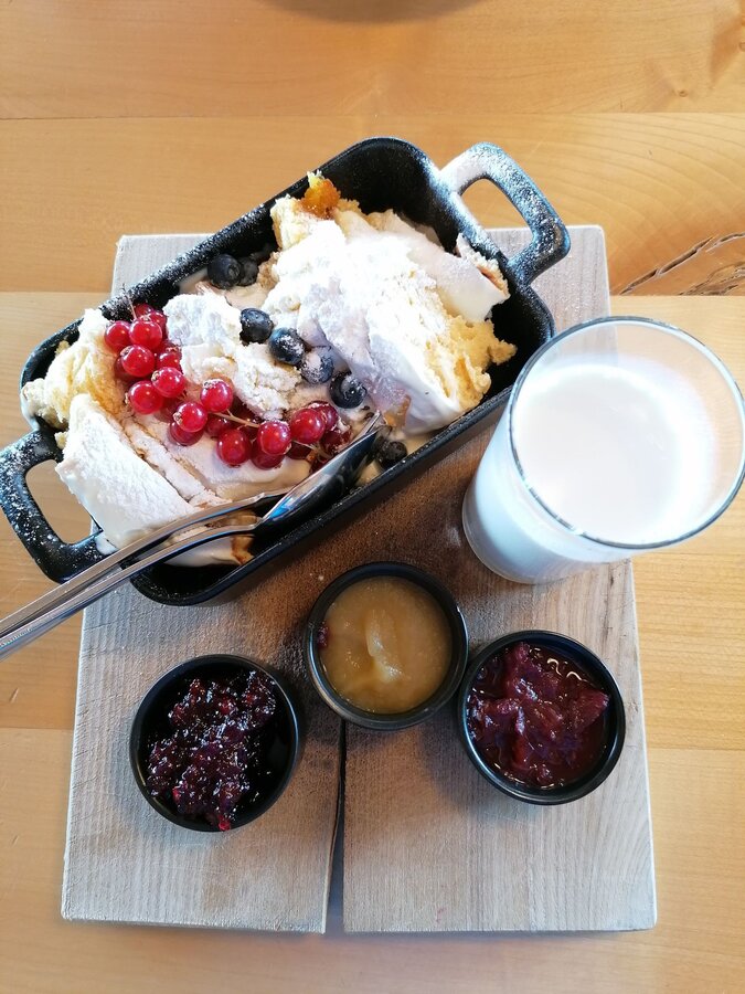Skifahren und über Essen reden macht hungrig. Auch wenn mich die österreichischen RIPPLA am Nebentisch anlachen, entscheide ich mich heute für etwas Süßes: einen soufflierten TOPFENSCHMARREN mit Fisser Goggala. Gereicht wird mir der Schmarren bäuerlich in einem gusseisernen Pfännchen und mit typischen Beilagen wie Apfelmus oder Zwetschkenröster. Passend dazu bestellte ich mir auch noch ein Glas MILCH, so wie früher. Gut zu wissen: Die Süßspeise gibt es nur auf Vorbestellung, jedoch zahlt sich das Warten aus!
