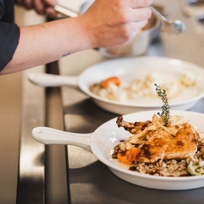 „Überall, wo es möglich ist, setzen wir auf regionale, lokale und saisonale Produkte. Unsere Fisser Imperial Gerste findet sich in der Gerstlsuppe, im Brot, Müsli, Risotto, Eintopf und sogar im Bier und Fissky wieder. Auch die Fisser Goggala werden in unseren Gerichten verarbeitet, beispielsweise für den KAISERSCHMARREN. Die Zusammenarbeit mit den BAUERN in unseren drei Dörfern und der Umgebung ist ausgesprochen gut. So ist das Schaffleisch aus Serfaus, die Hennen aus Zams, das Ziegenfleisch aus Tobadill oder das Tiroler GRAUVIEH-Fleisch direkt aus der Region. Etwa 70 Stück Grauvieh-Rinder werden jährlich von den Bauern zu einem höheren Preis gekauft.“
