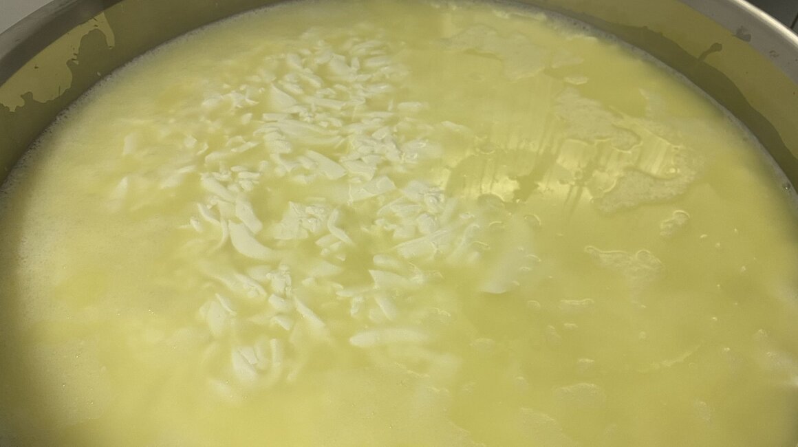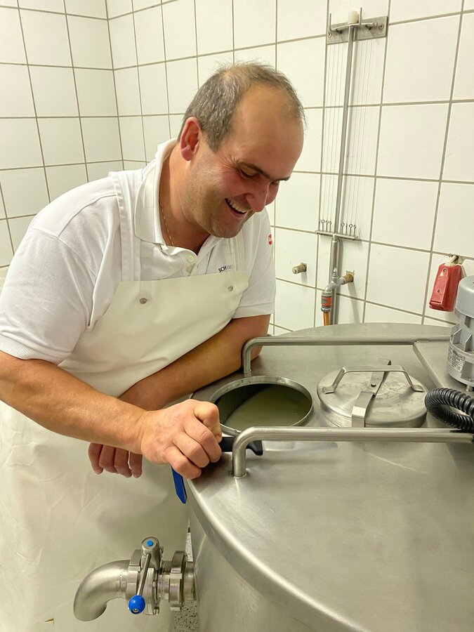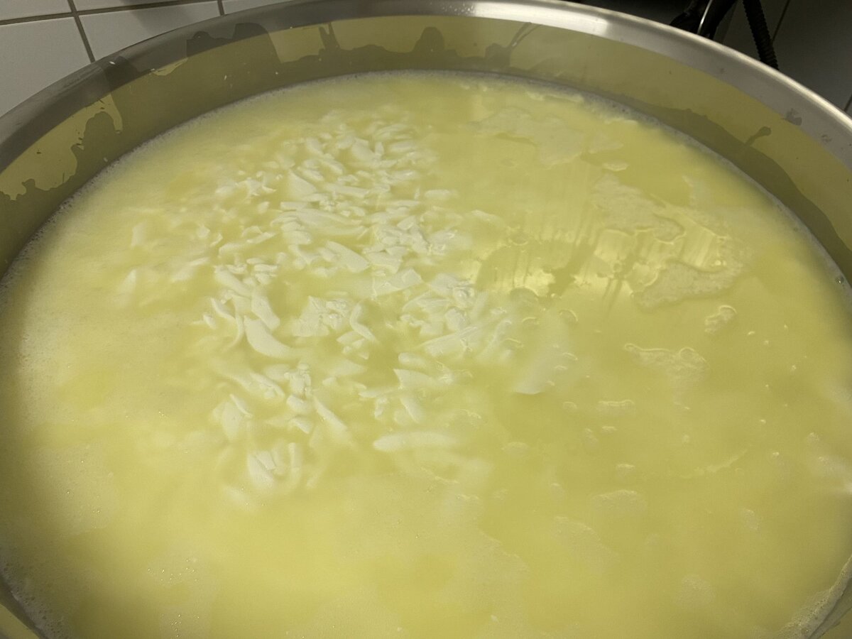 Nach dem Frühstück machen Hans und ich uns an die Arbeit. Es ist Zeit, Käse herzustellen. Ganz gespannt verfolge ich den beeindruckenden Prozess, den ich euch nicht vorenthalten will:
