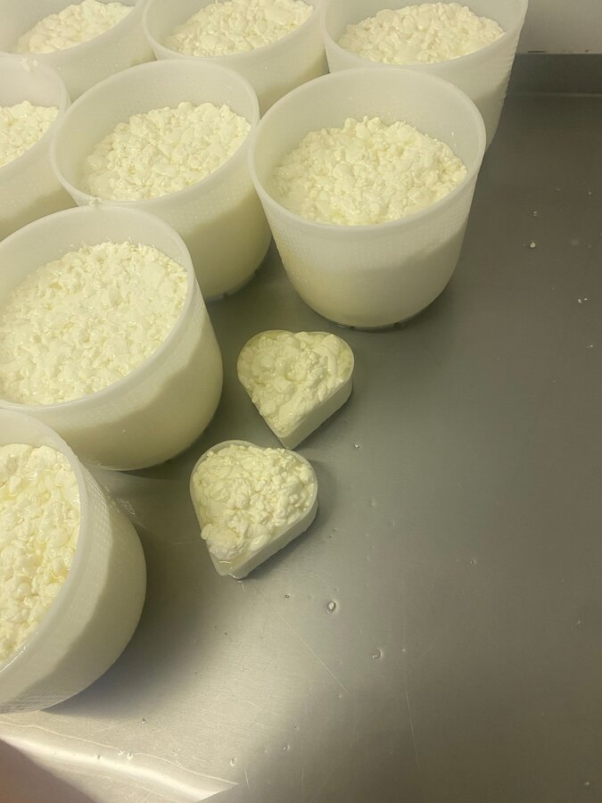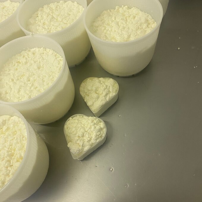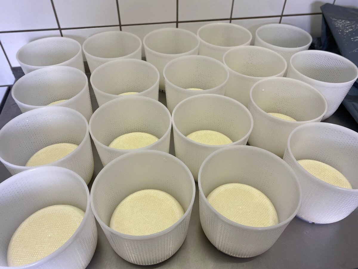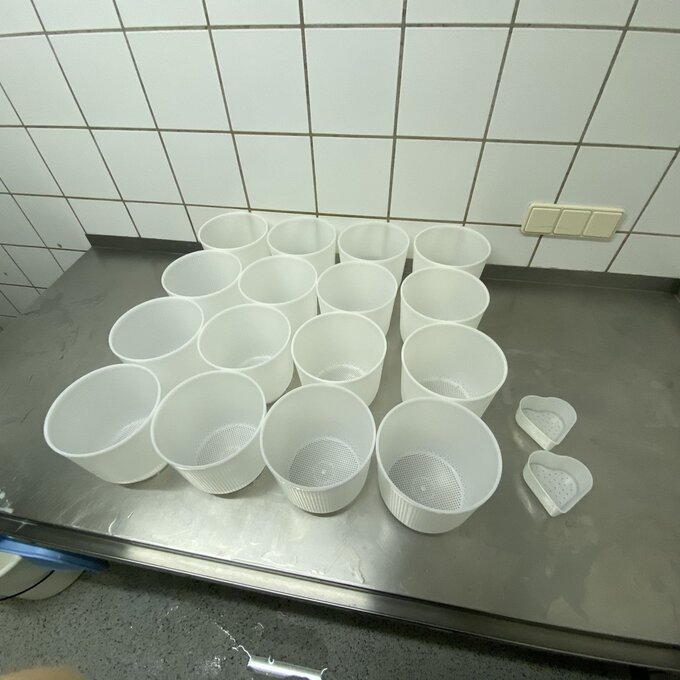 7. Käse wird in vorbereitete Käseformen abgefüllt