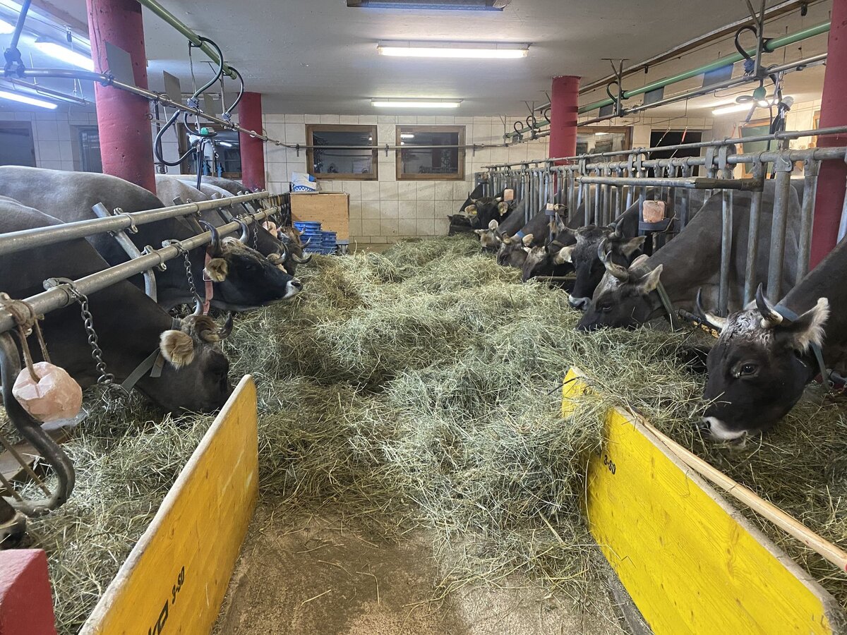 Neben den 16 Milchkühen und neun Kälbchen warten draußen noch weitere Jungtiere und die Schafe eine Etage höher. Mit der Haltung von insgesamt 46 Stück Tiroler Grauvieh, einem Stier, dem „hottest boy in town“, vier Mutterschafen, einem Widder und vier Lämmchen hat der Gasslbauer in der Früh, zu Mittag und am Abend reichlich zu tun. Nachdem alle Tiere versorgt sind, die Milch in den Kessel gepumpt wurde, alles gespült und ordentlich verräumt ist, geht es in die warme, gemütliche Bauernküche, um mit der restlichen Familie zu frühstücken.