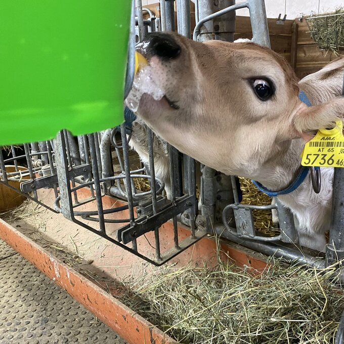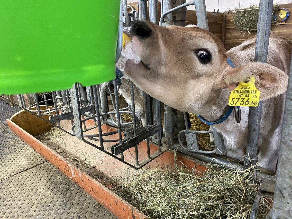 Auch die Kälbchen haben Hunger. Ich darf Hand anlegen und übernehme die Aufgabe des Fütterns. Erst die Milch, dann das Müsli und zum Nachtisch ein bisschen Heu. Ein 3-Gänge-Gaumenschmaus für die kleinen Vierbeiner, damit sie groß und stark werden.