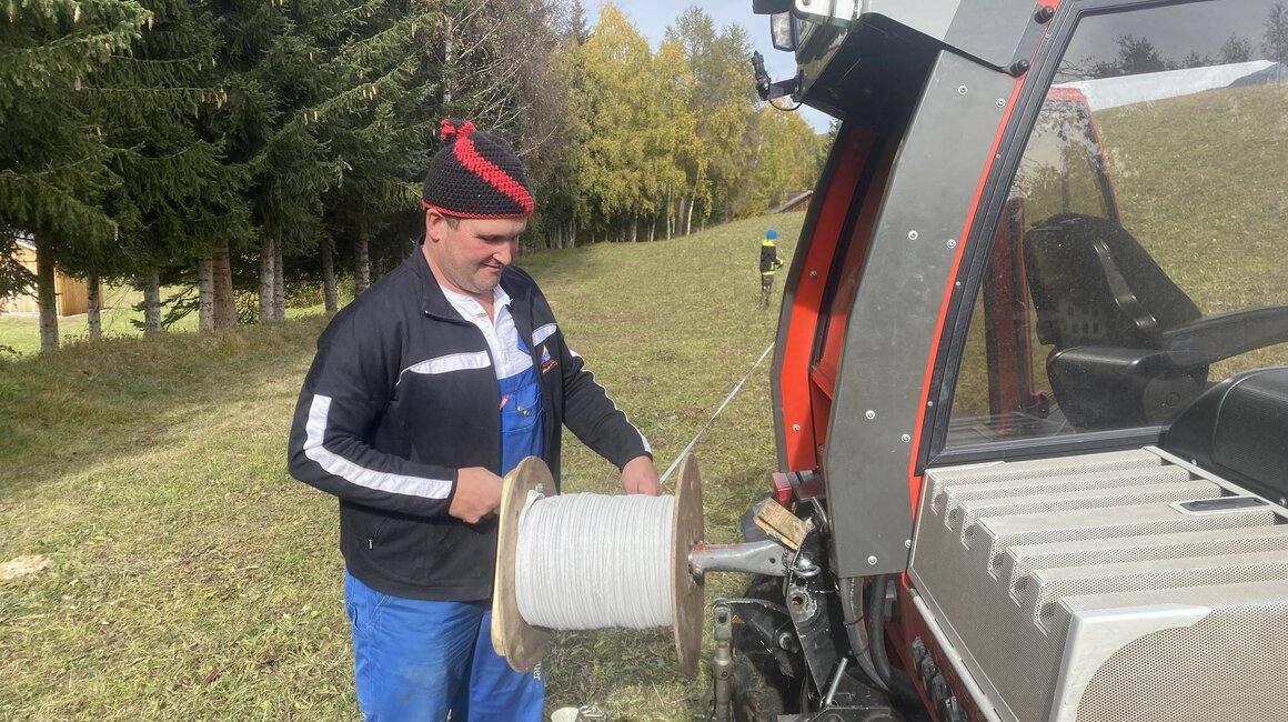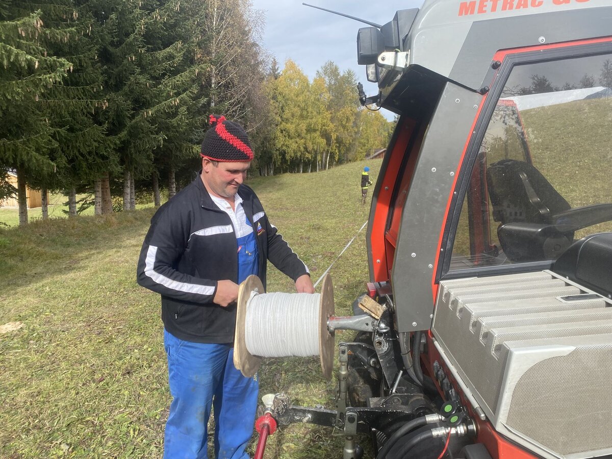 Während ich die Aufgabe bekomme, den Käse jede halbe Stunde zu wenden, machen sich Hans und Andreas auf den Weg, um ein paar Erledigungen abzuarbeiten. Ich überrasche die beiden um zwölf Uhr mit einer frisch gekochten Kürbissuppe, die ich neben dem Käsewenden und Joghurtabfüllen gezaubert habe. Nach dem Mittagessen muss Andreas zu seiner Arbeit. Hans und ich fahren nach Überwasser, um den Zaun abzubauen. Der Wind weht und es ist kühl, aber die Arbeit muss trotzdem erledigt werden. Um etwa halb drei sind wir dann schließlich fertig und fahren zurück zum Hof. Der Automat muss gefüllt und noch ein paar andere Dinge erledigt werden, bevor ein bisschen Zeit für Kaffee und Lebensgeschichten bleibt.