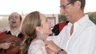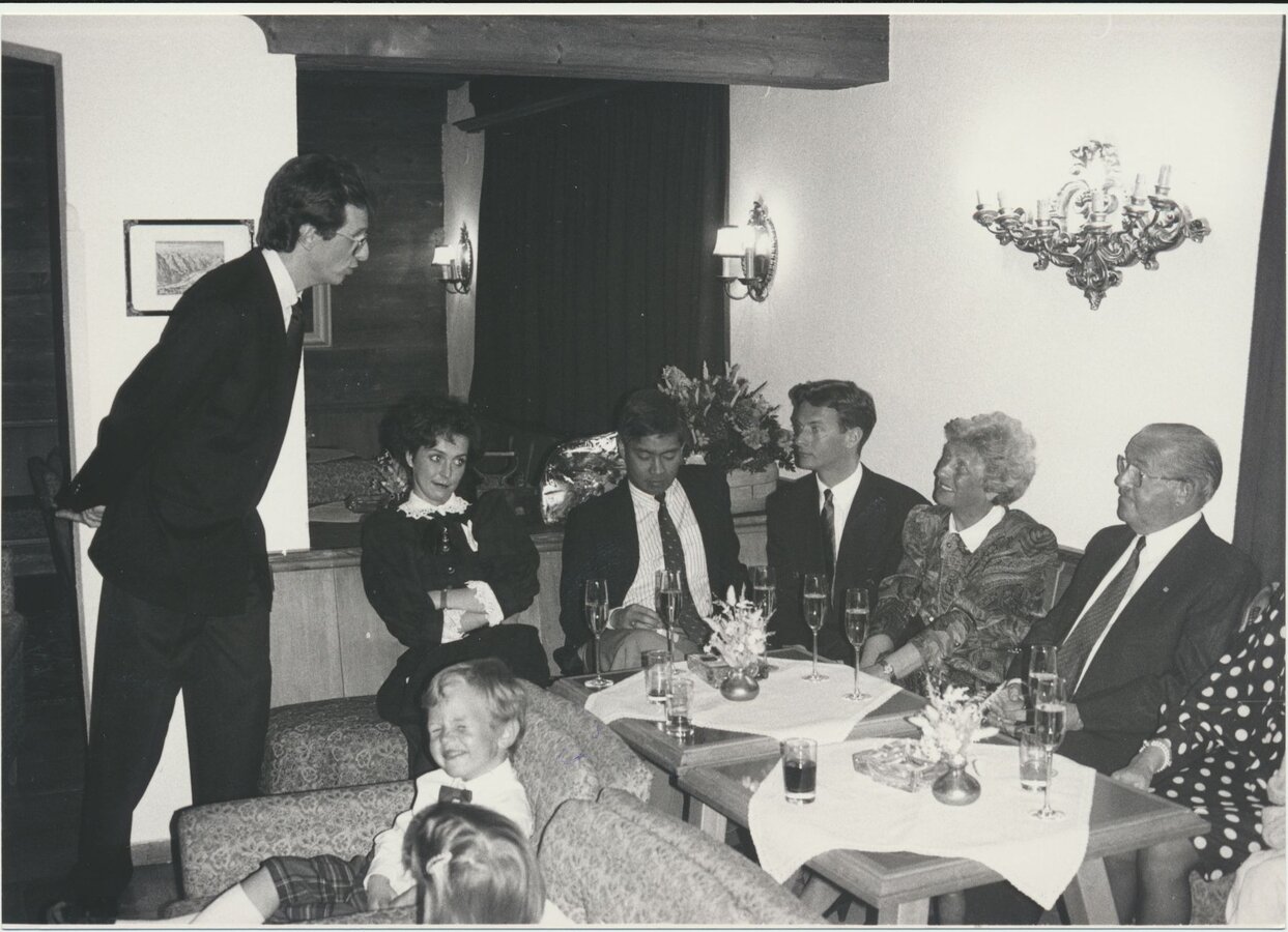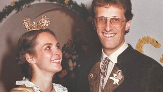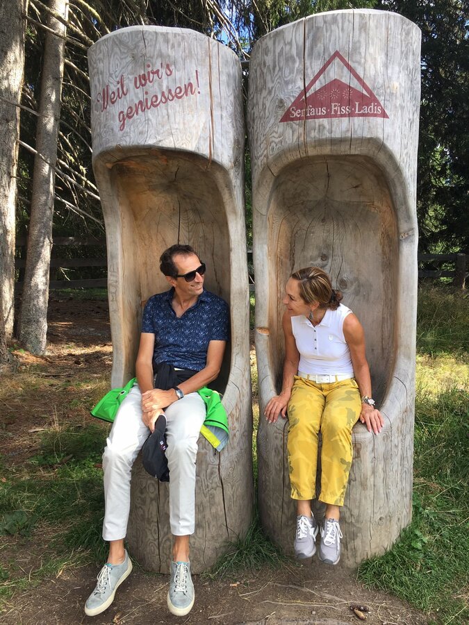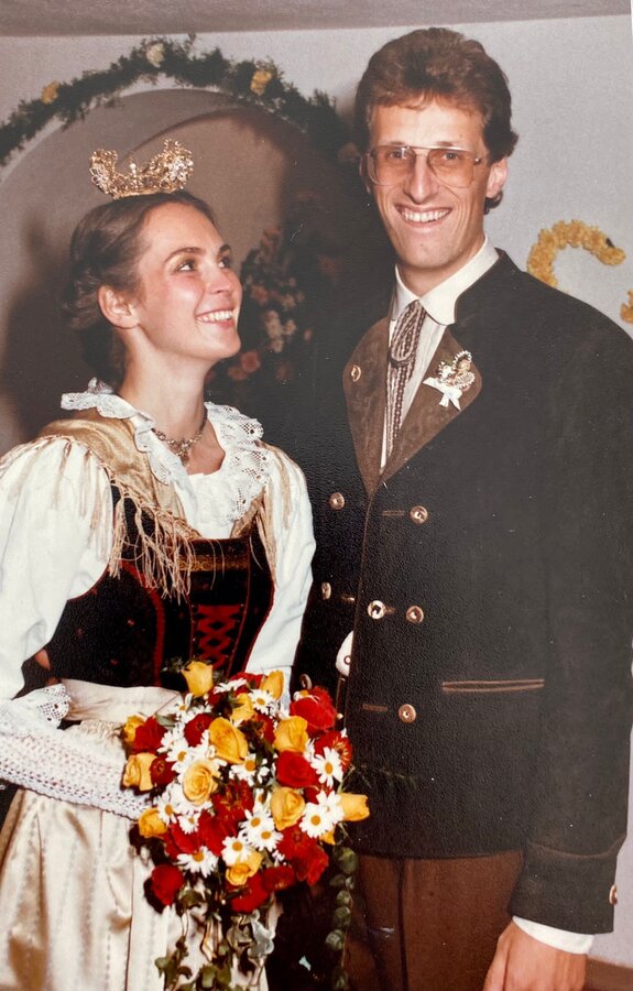 1979 lernte Franz seine Frau kennen. Er studierte damals in St. Gallen Betriebswirtschaft mit Spezialrichtung Tourismus und besuchte zugleich in Innsbruck Vorlesungen in Recht als Zusatzausbildung. Sabine studierte Deutsch und Französisch in der Landeshauptstadt. Sie erinnert sich an ihr erstes Kennenlernen: „Ich war 19 und wollte mit einer Freundin an einem TENNIS-KURS an der Sportuni teilnehmen. Franz war mit zwei Freunden dort. Leider war der Kurs schon voll und wir mussten wieder gehen. Ich habe ihm dann meine Festnetznummer gegeben. Unser erstes Date hatten wir in einem Gasthaus: Wir aßen – ganz ROMANTISCH - Leberknödelsuppe und haben uns gut unterhalten. Ein Romantiker war und ist mein Franz einfach nicht. Vier Jahre später haben wir uns dann verlobt und 1984 GEHEIRATET. In Serfaus haben wir dann nochmal versucht, Tennis zu spielen. Das war aber nichts für uns als Paar. Ansonsten ergänzen wir uns wunderbar und machen gerne Sport.“