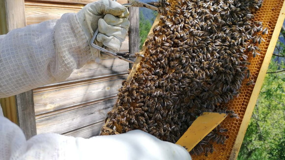Der Aufwand für ein Glas Honig ist wirklich beträchtlich und das Imkern eine wahre Wissenschaft. So ganz ungefährlich ist diese Leidenschaft aber nicht. Dementsprechend gut ausgerüstet und geschützt geht ein Imker an sein Werk. Bei meinem Besuch bei Alfred bekomme auch ich einen Arbeitsmantel mit Tüllhut und dicke Handschuhe. Auch wenn mein Herz trotz Schutzkleidung plötzlich ein wenig schneller zu schlagen beginnt, nehme ich meinen ganzen Mut zusammen und folge Alfred unauffällig vom Inneren der Holzhütte zu den zahlreichen Bienenstöcken. Mehr als ein Dutzend Völker sind hier in Fiss zuhause. Mit einem Freund betreut Alfred die Bienen hier. Etwa einmal pro Woche besucht er seine Insekten. Das Summen der Carnica-Bienen ist unüberhörbar. Während Alfred mir erzählt, dass ein Volk etwa 60.000 Bienen zählt, versuche ich, mich auf seine Stimme zu konzentrieren und die wuselnden Bienen um mich herum ein wenig auszublenden. Ich bin von den emsigen Tierchen derart fasziniert, dass in wenigen Sekunden gar kein Platz für Angst bleibt.